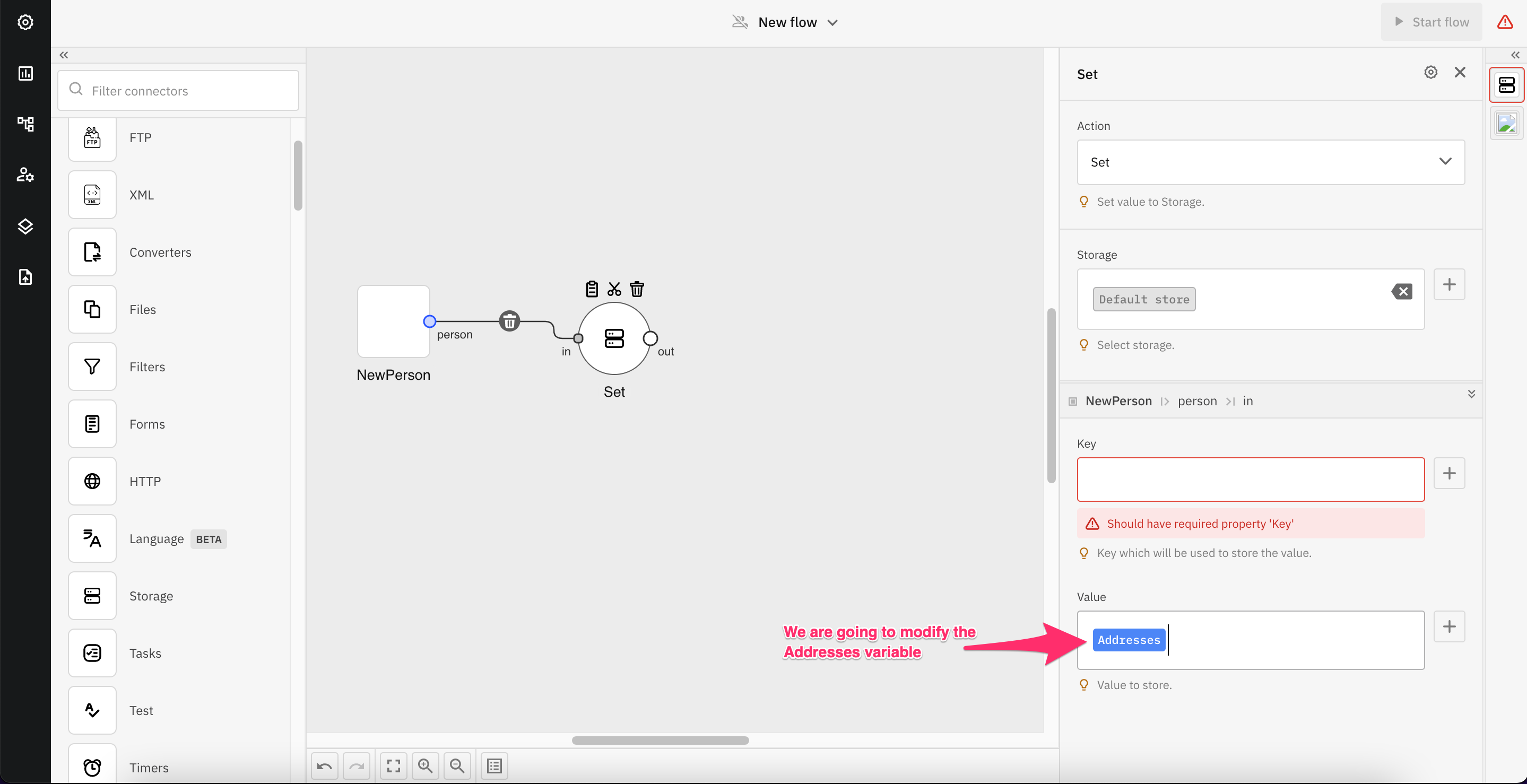 One of the use cases is to be able to access nested properties in a variable, if that variable has its type as object and has its schema defined. In our example, the name variable has two nested properties: firstname and lastname. So when we connect a component to the output of our NewPerson component, we will be able to select the nested properties directly: