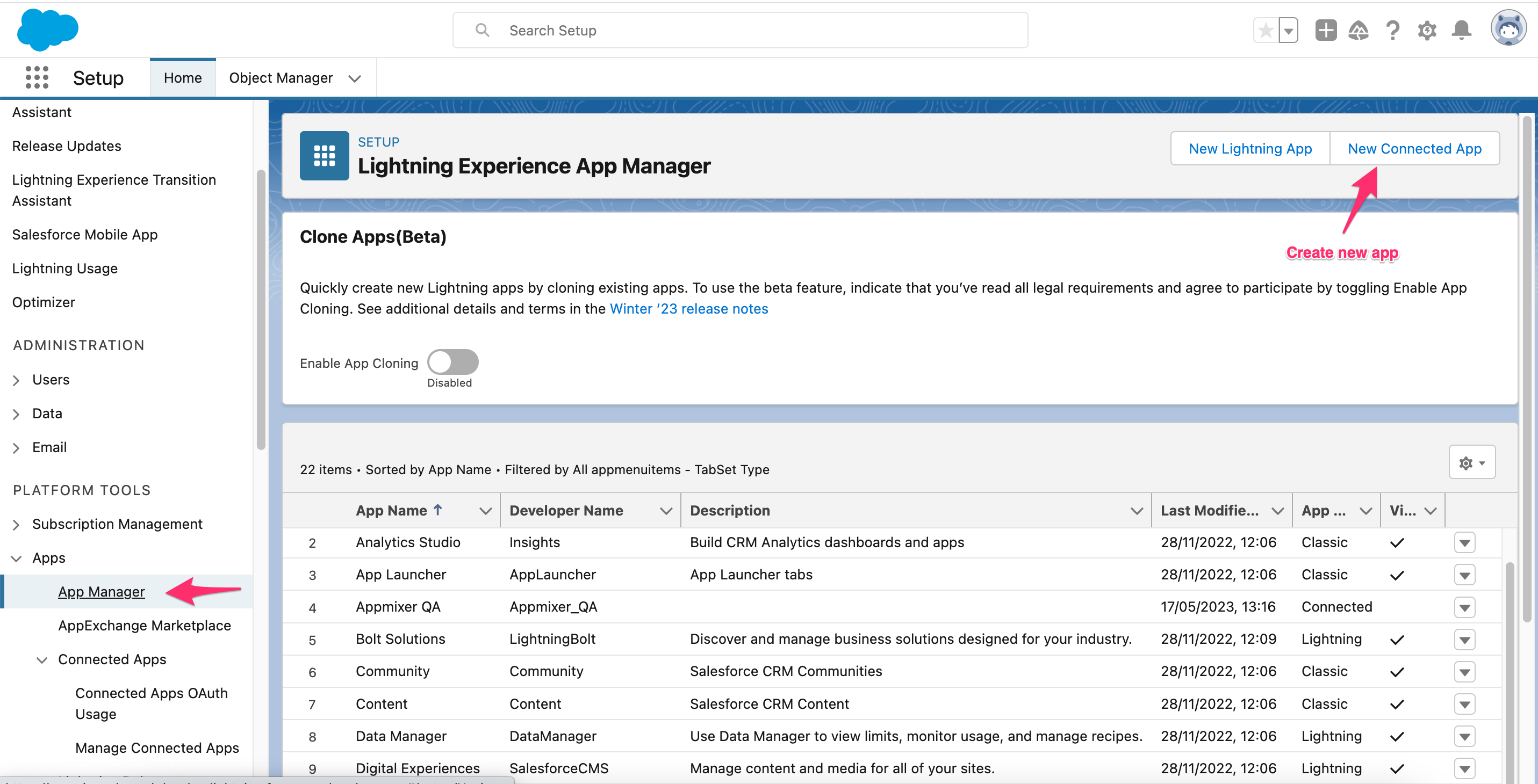 To integrate Appmixer with Salesforce, you are going to need an app in your Salesforce account. You can either create a new one or use one that already exists.