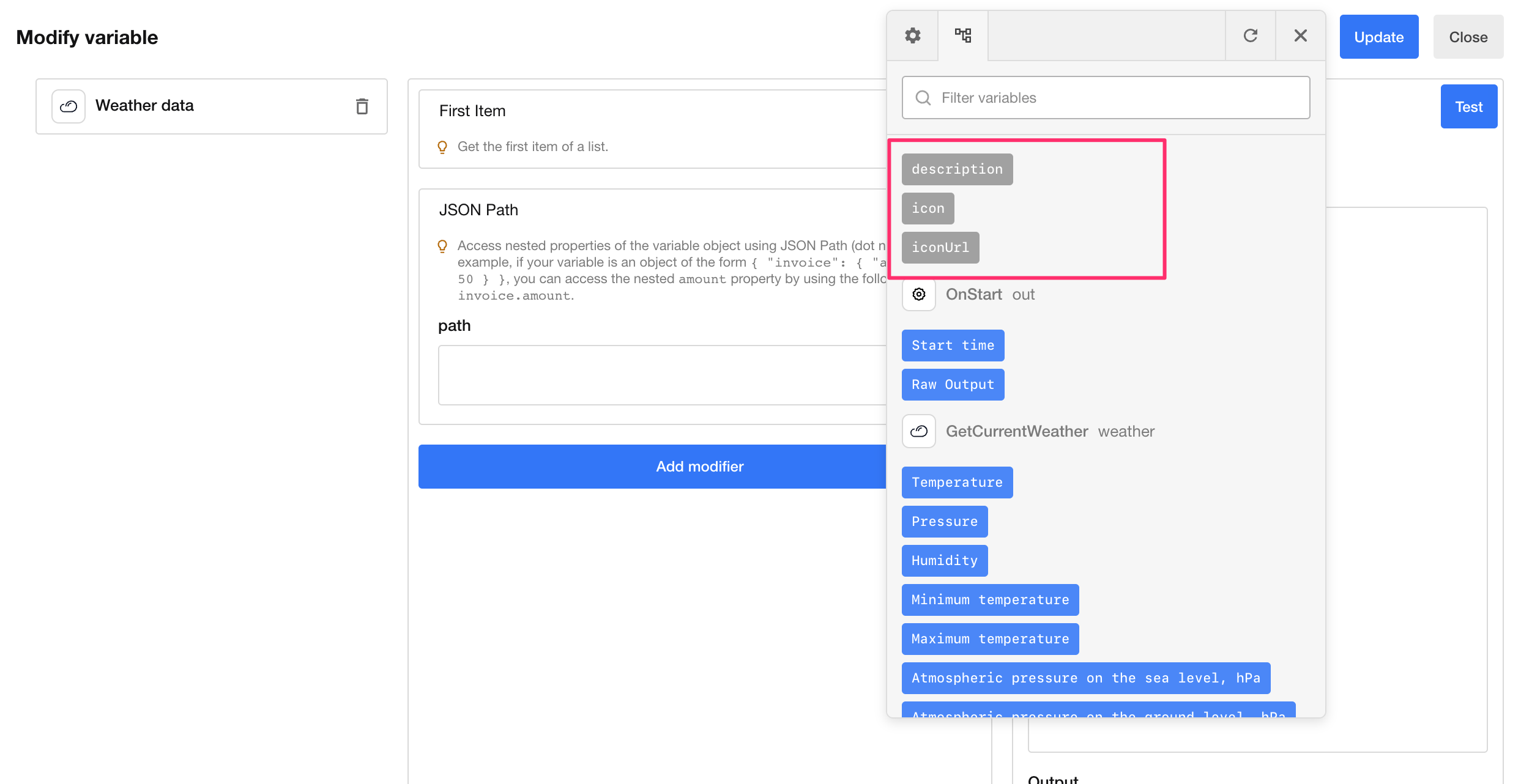 { "label": "Weather icon URL", "value": "weather[0].iconUrl" }