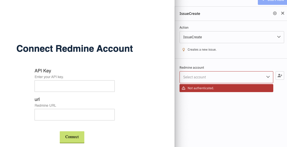 You will enter this API key and also the URL of your Redmine installation in when connecting each Redmine component.