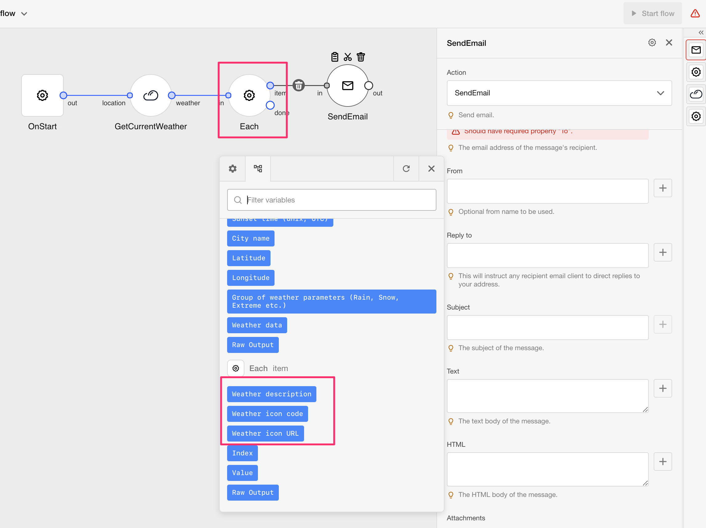 And if you use the *Each* connector, you will see the `item properties` in the Variables picker.