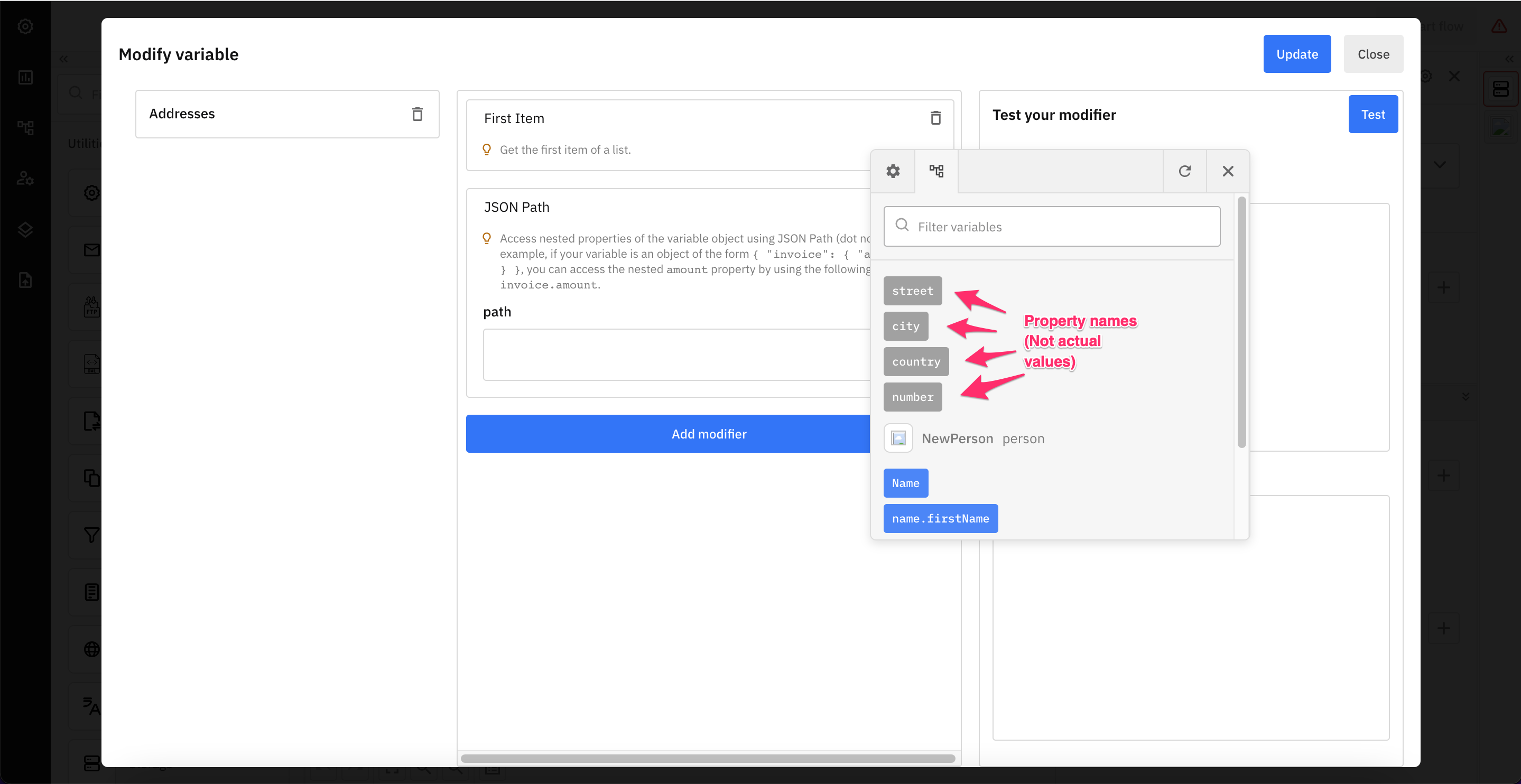 As you can see, we take the first item of the array, and now we want to access a property from this item, so we use the `JSON Path` modifier. In the variables list we can see that the property names are there. **It is very important to note that this are just the property names, not the actual values inside the item**. So for example the variable `street` will be evaluated to the string "street", and this will work fine in our example because we are using the `JSON Path` modifier.
