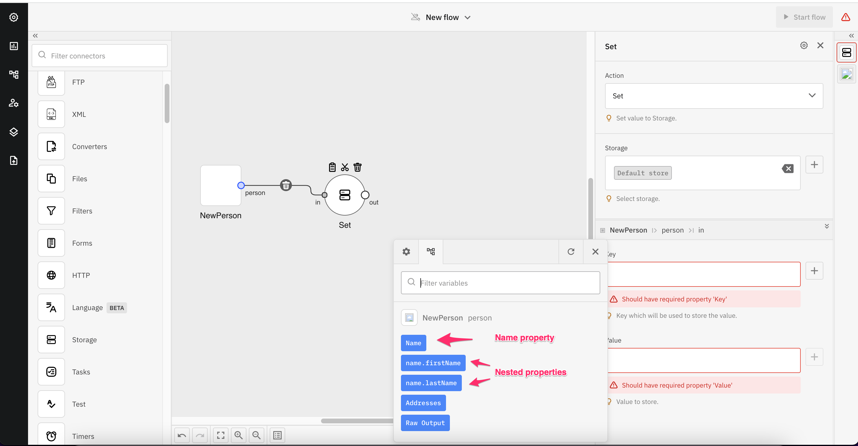 One of the use cases is to be able to access nested properties in a variable, if that variable has its type as object and has its schema defined. In our example, the name variable has two nested properties: firstname and lastname. So when we connect a component to the output of our NewPerson component, we will be able to select the nested properties directly:
