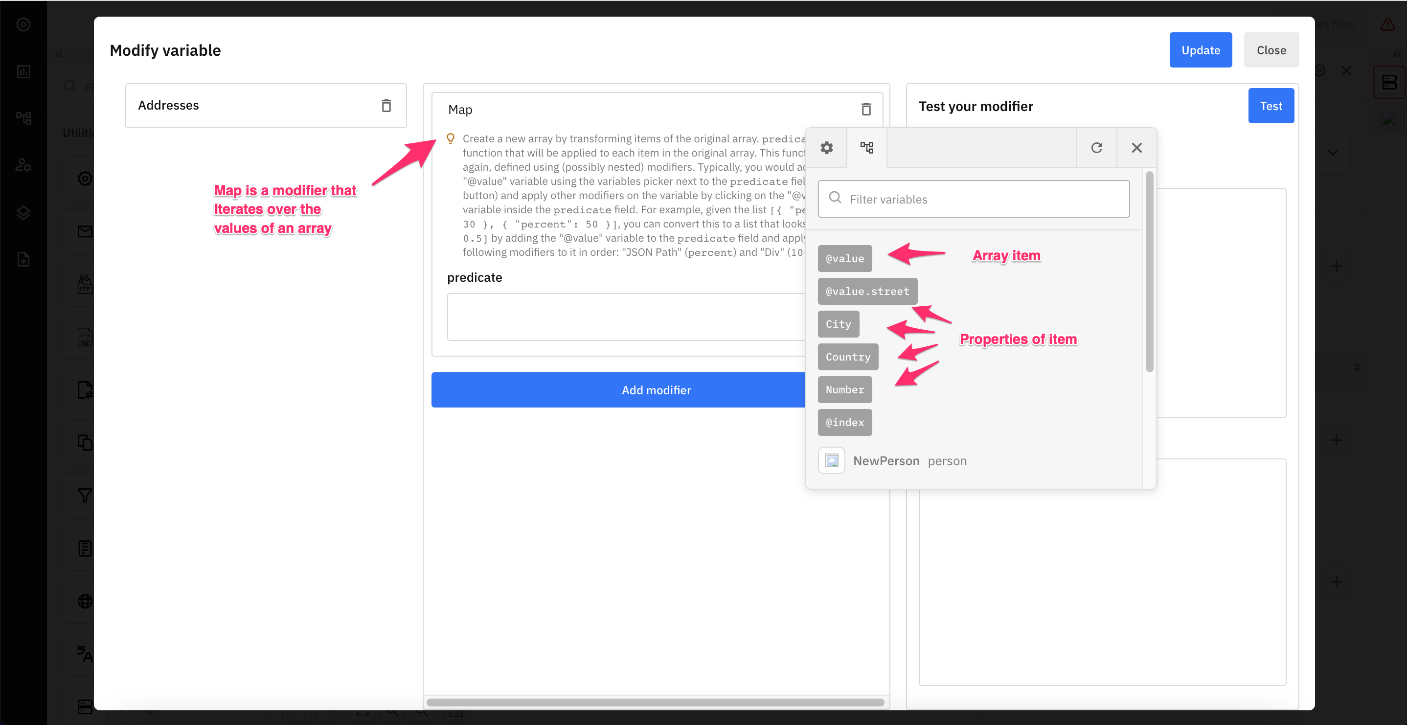 Another use case is when using array data, like the addresses property in our example, we can access directly to the properties of each item when using a modifier that iterates over an array (Each, Map, Filter...):