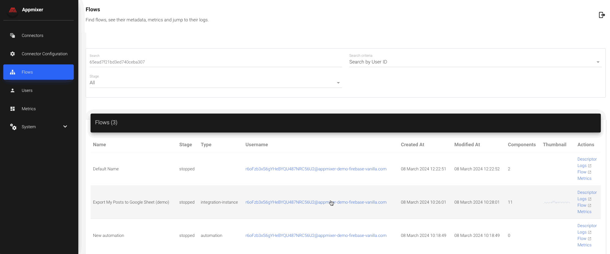 After locating the flow you intend to troubleshoot, proceed to examine the flow's logs and configuration. Click on the "Logs" link to view the flow's logs, and utilize the "Flow" link to inspect the flow's configuration in the Appmixer Designer.