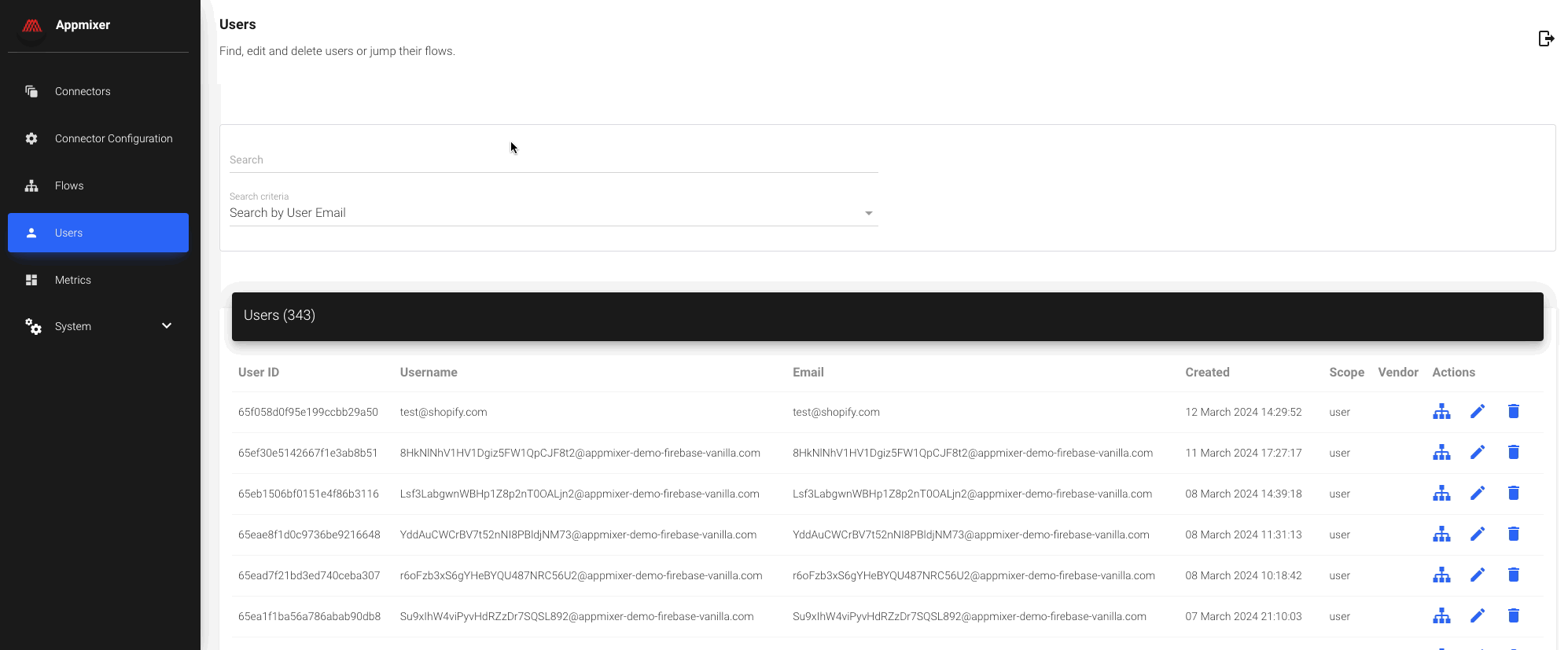In the "Users" section, you'll find a comprehensive list of all users within the system. The interface allows you to search for users based on multiple criteria, with email being the most common search parameter. Upon locating a user, you can click on the Flows icon (![](https://1556994647-files.gitbook.io/~/files/v0/b/gitbook-x-prod.appspot.com/o/spaces%2FUaFilImHHLqJ2jPd88UX%2Fuploads%2FIXi7Cbhe88jMPlEUcwXV%2Fimage.png?alt=media\&token=5816792c-8d69-45cb-b6c4-8aa5b7e89b9e)) to view all the flows associated with that user, including integration instances and automations.&#x20;