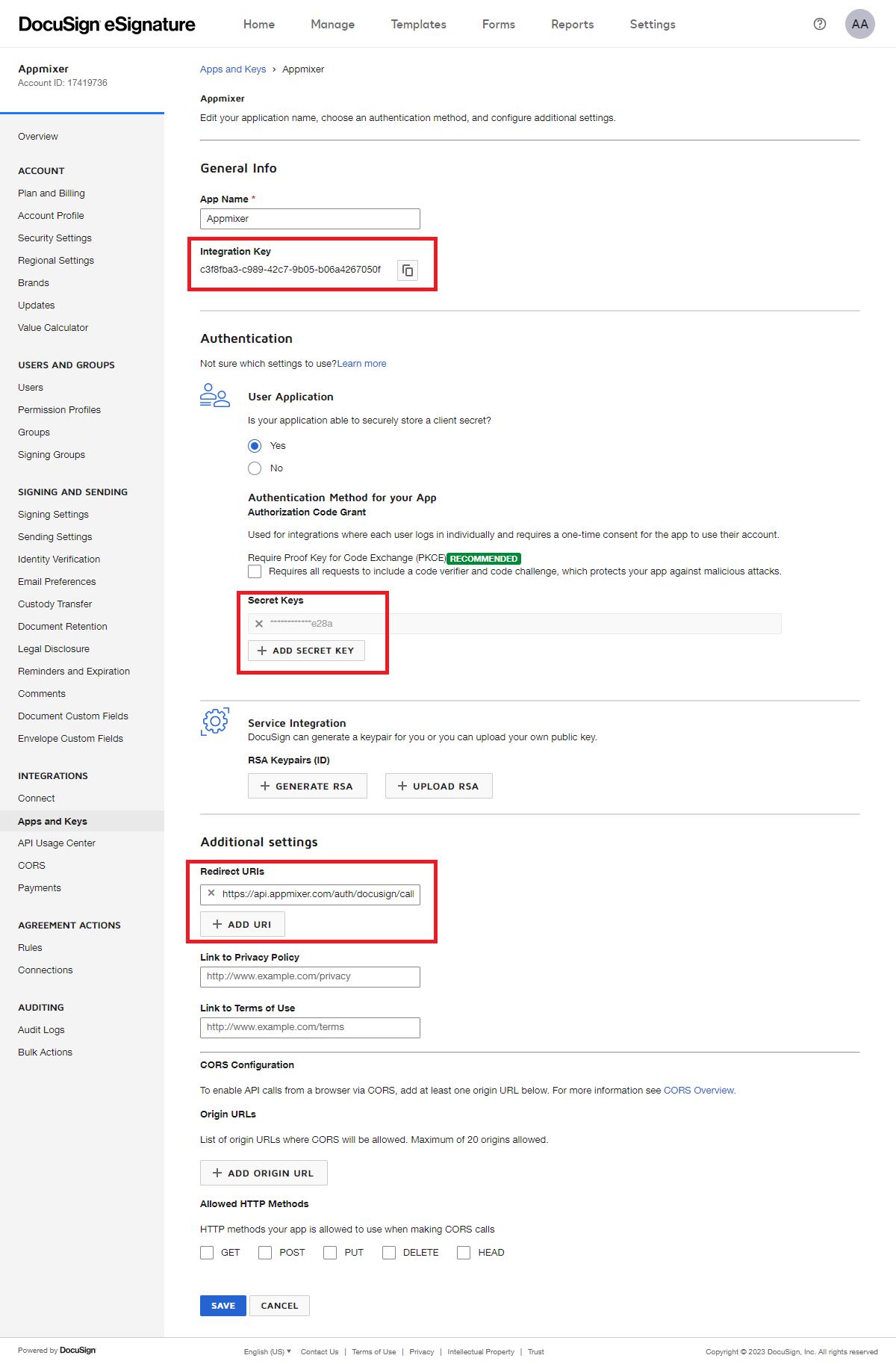 set the Redirect URI to https://[YOUR_API_BASE]/auth/docusign/callback, for example https://api.appmixer.com/auth/docusign/callback