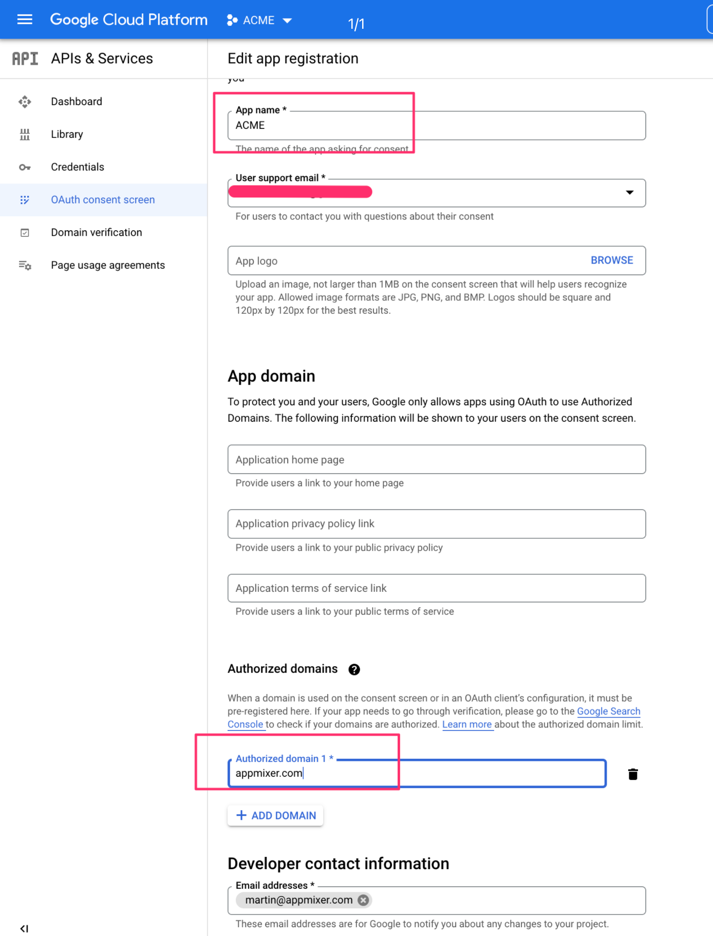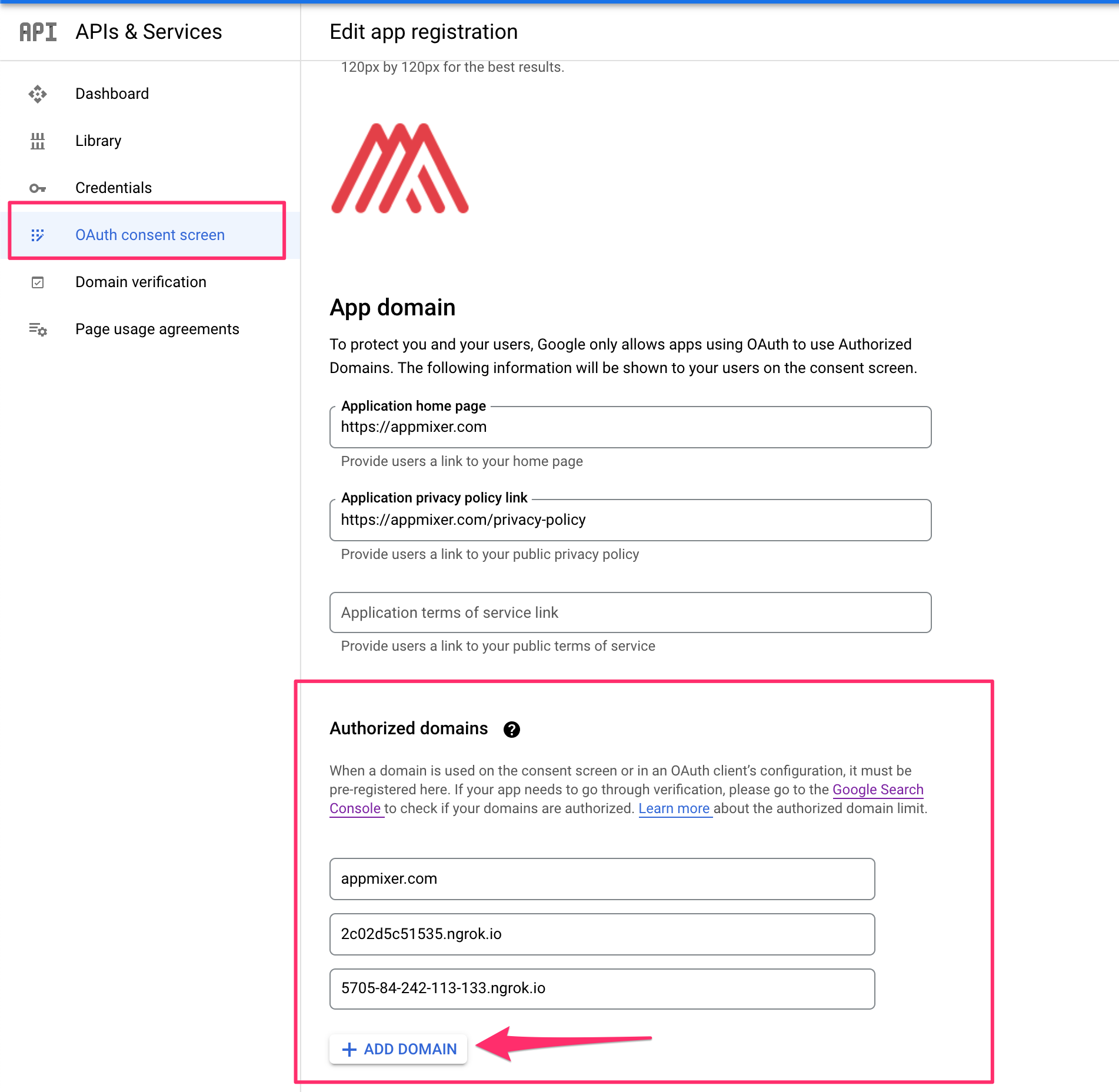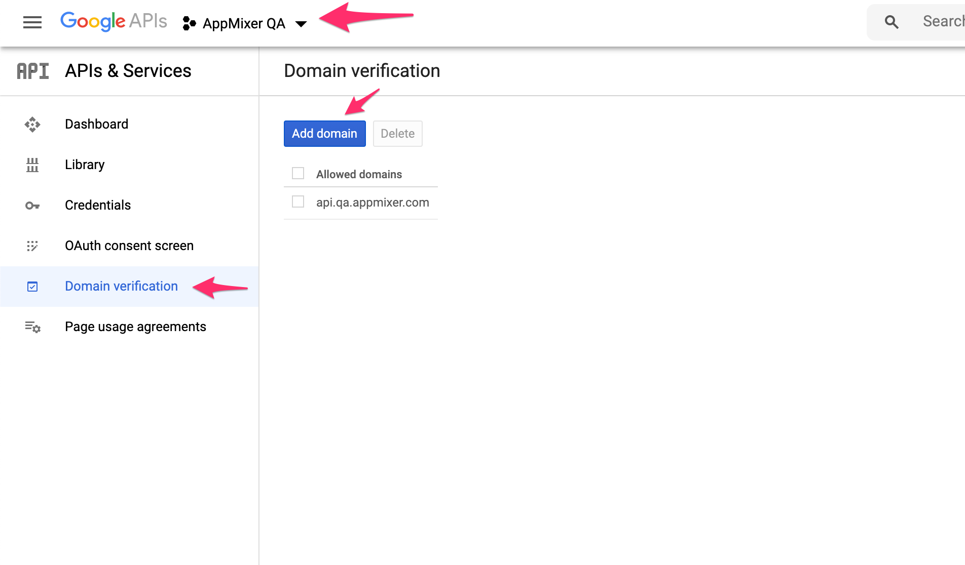 Now, you can go back to the developer console and add the api.YOUR_TENANT.appmixer.cloud domain once more. But this time, because it's already verified, it will appear in the list of your domains.
