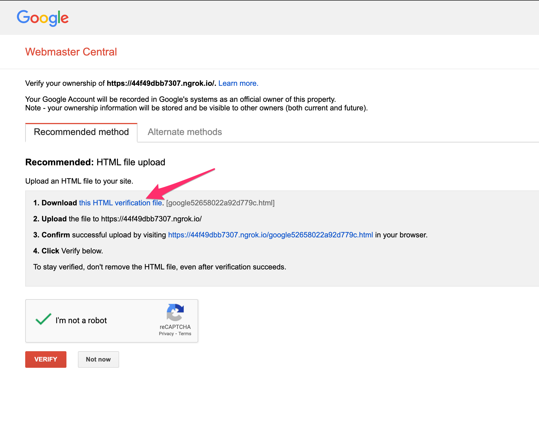Again, use api.YOUR_TENANT.appmixer.cloud. Then download the HTML verification file.