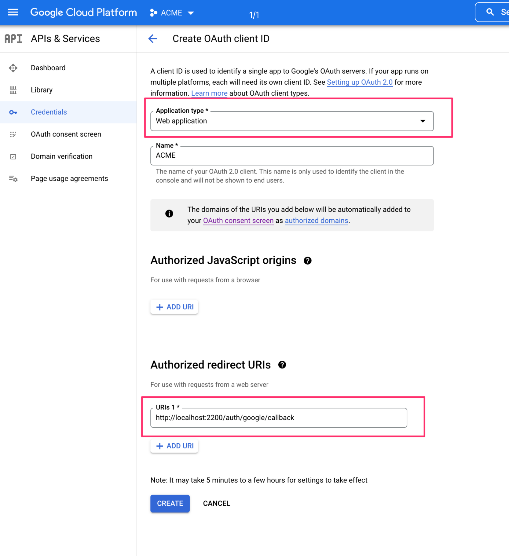 For the purpose of this tutorial, we are going to use localhost:2200 which is the default port for the Appmixer API when running on localhost. If you are creating an Oauth application for your production/QA, the URI of your server will be here. The suffix /auth/google/callback will remain there.