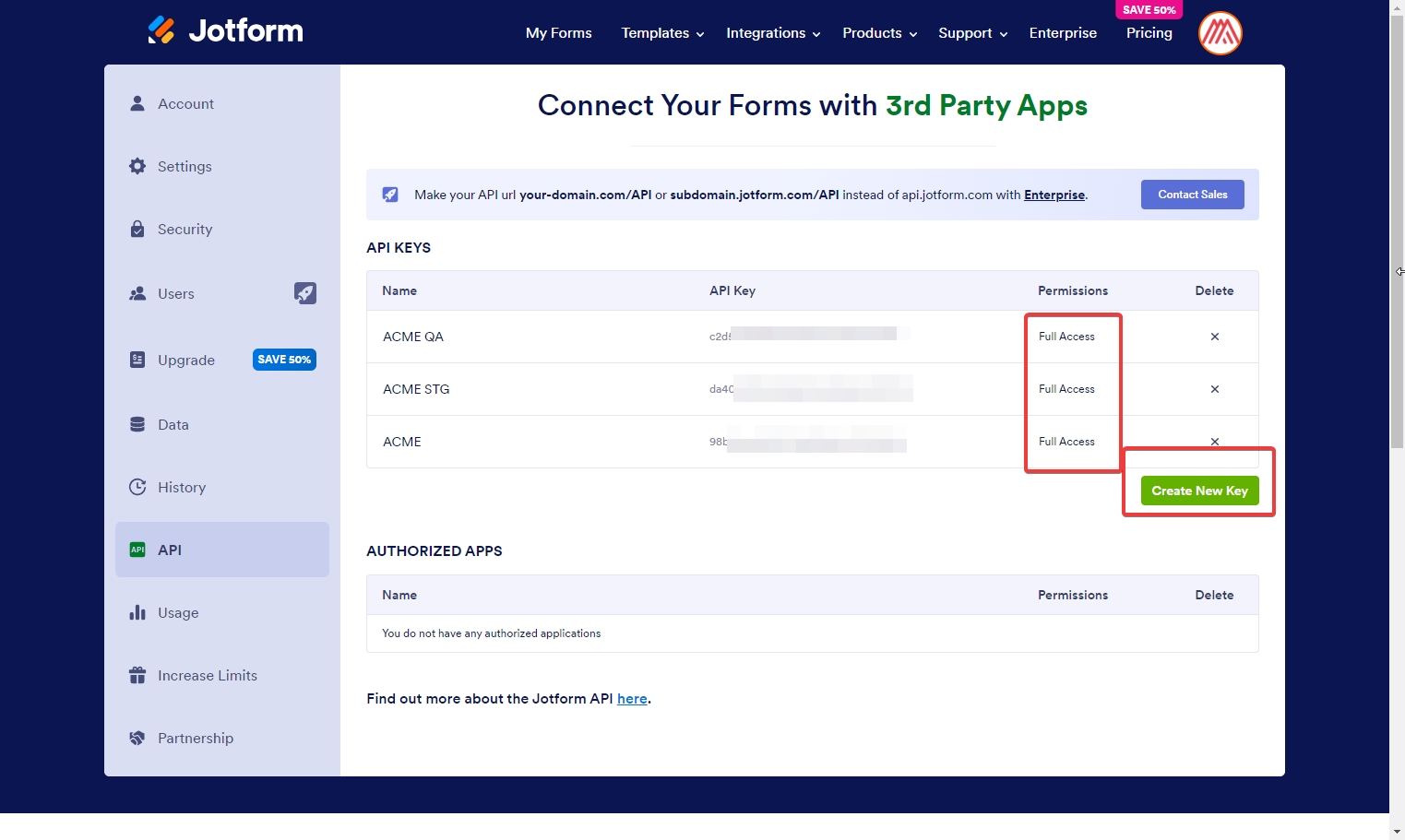 Navigate to Account Settings: Click on your avatar/initials in the top right corner of the page. Choose "Settings" from the dropdown menu. Or go directly to the https://jotform.com/myaccount/api