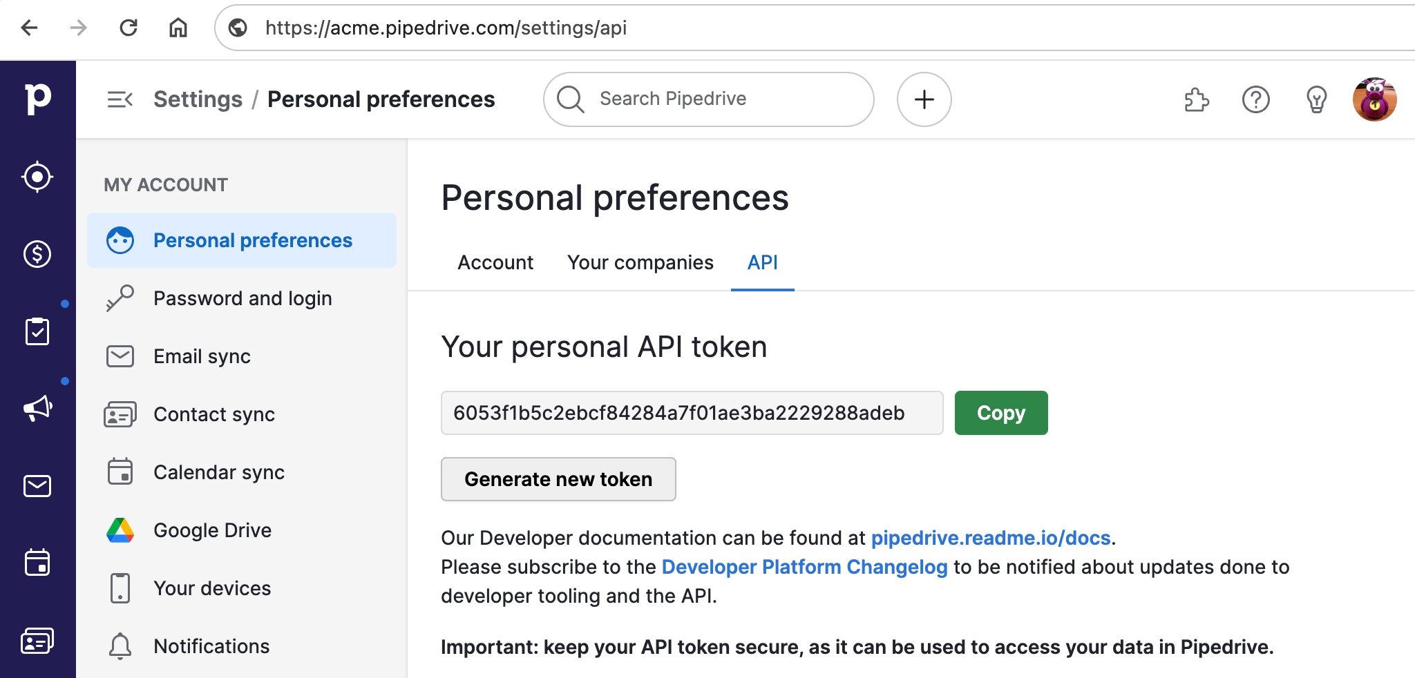 Navigate to My Account -> Personal Preferences -> API. Copy the API token.
