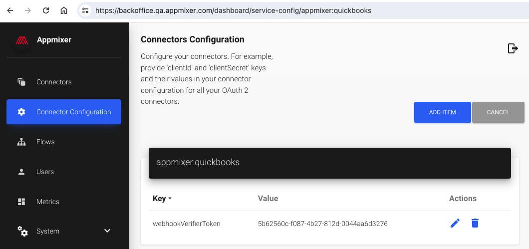 Make sure to copy the **Verifier Token** and paste it to the Appmixer BackOffice -> Configuration -> `appmixer:quickbooks` -> `webhookKey` field.