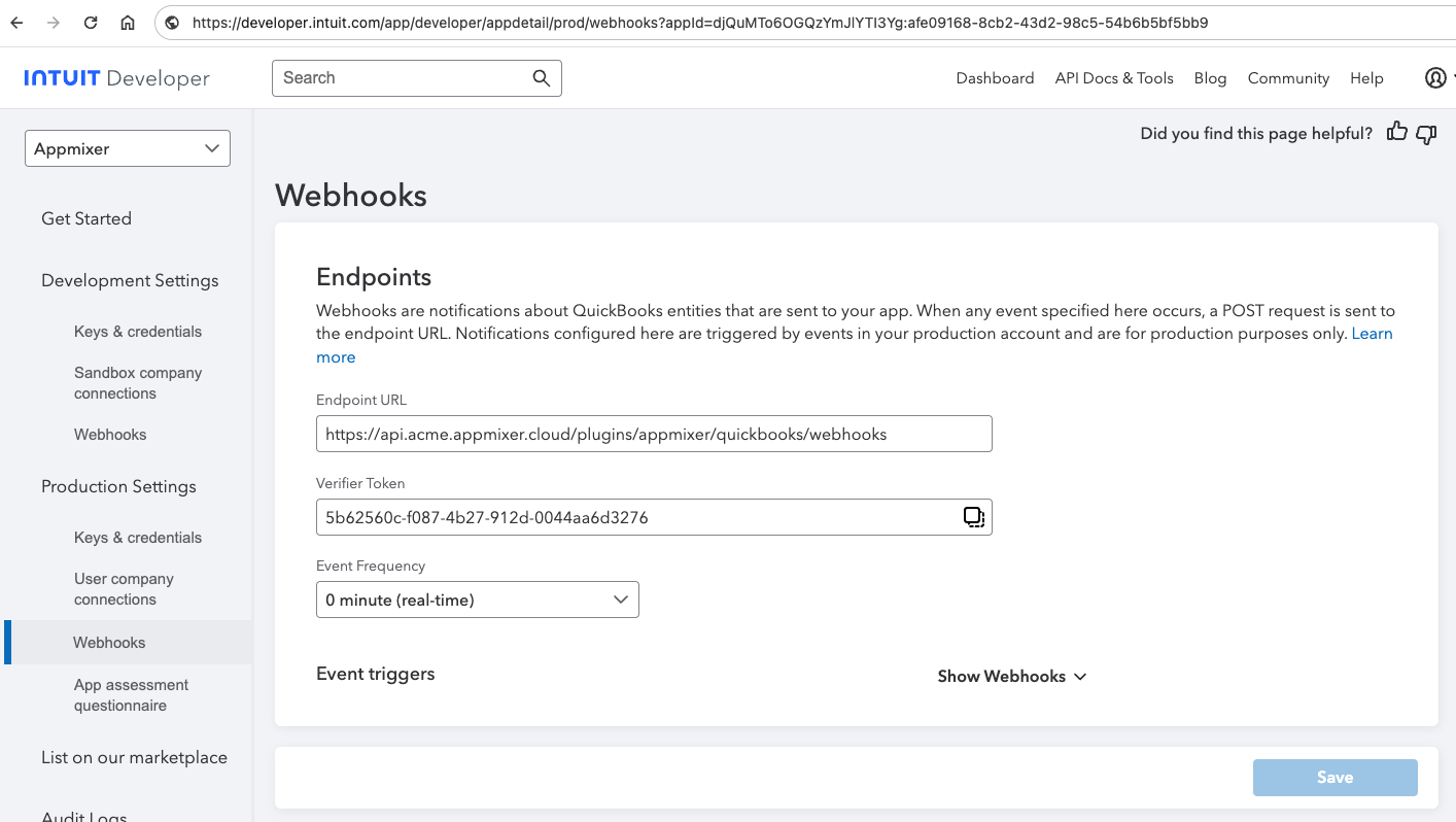 Go to <https://developer.intuit.com/app/developer/dashboard> then choose your Appmixer app. Navigate to the "Webhooks" section either for the sandbox or production environment and add a new webhook.