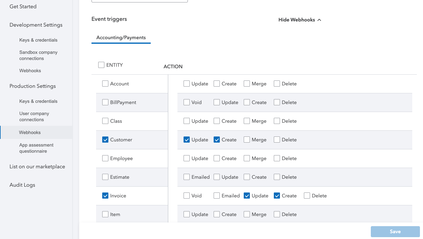 <figure><img src="https://content.gitbook.com/content/cfhstxIZQWZNvWjV2O6F/blobs/J6xH3sQExuw0ZkYdtwmT/quickbooks-5.png" alt=""><figcaption><p>QuickBooks Webhooks event triggers</p></figcaption></figure>
