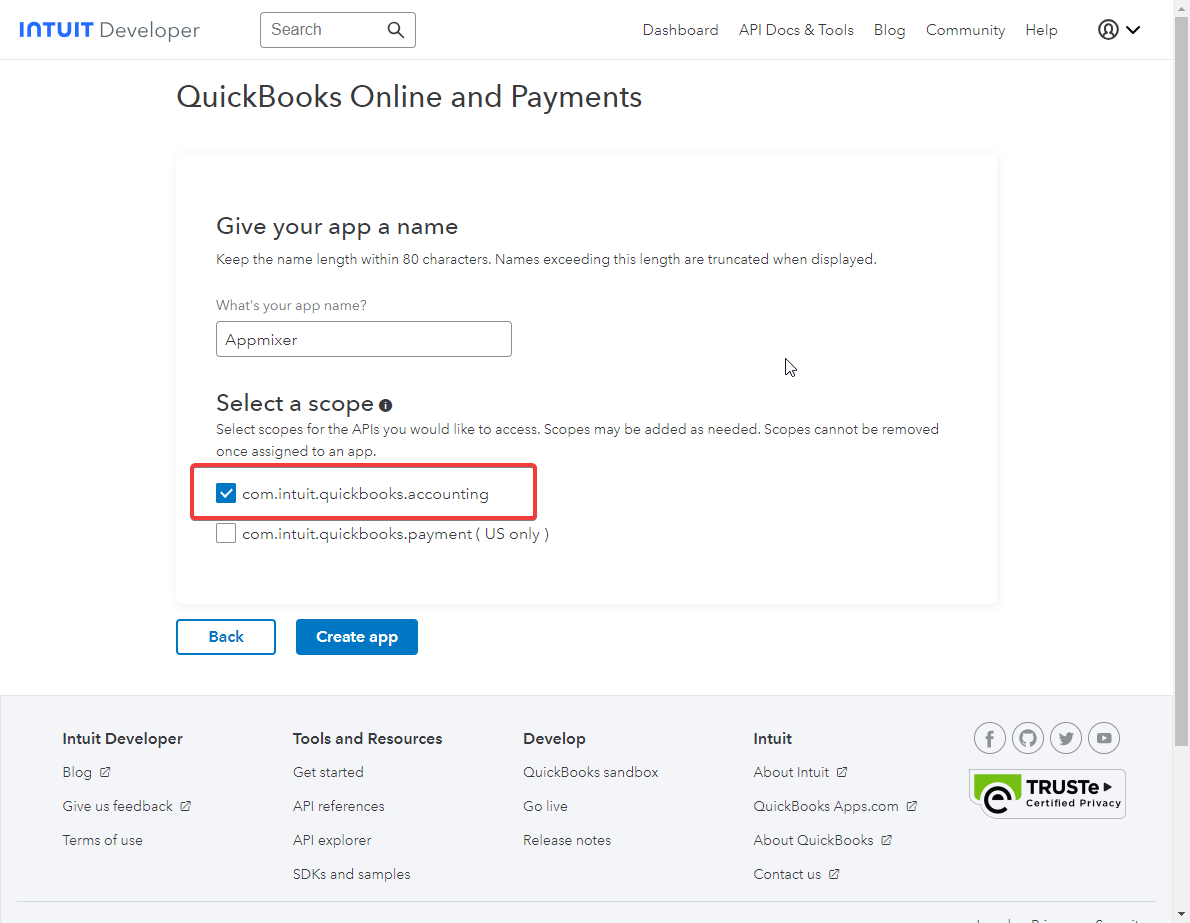 go to the <https://developer.intuit.com/app/developer/dashboard> to create a new app