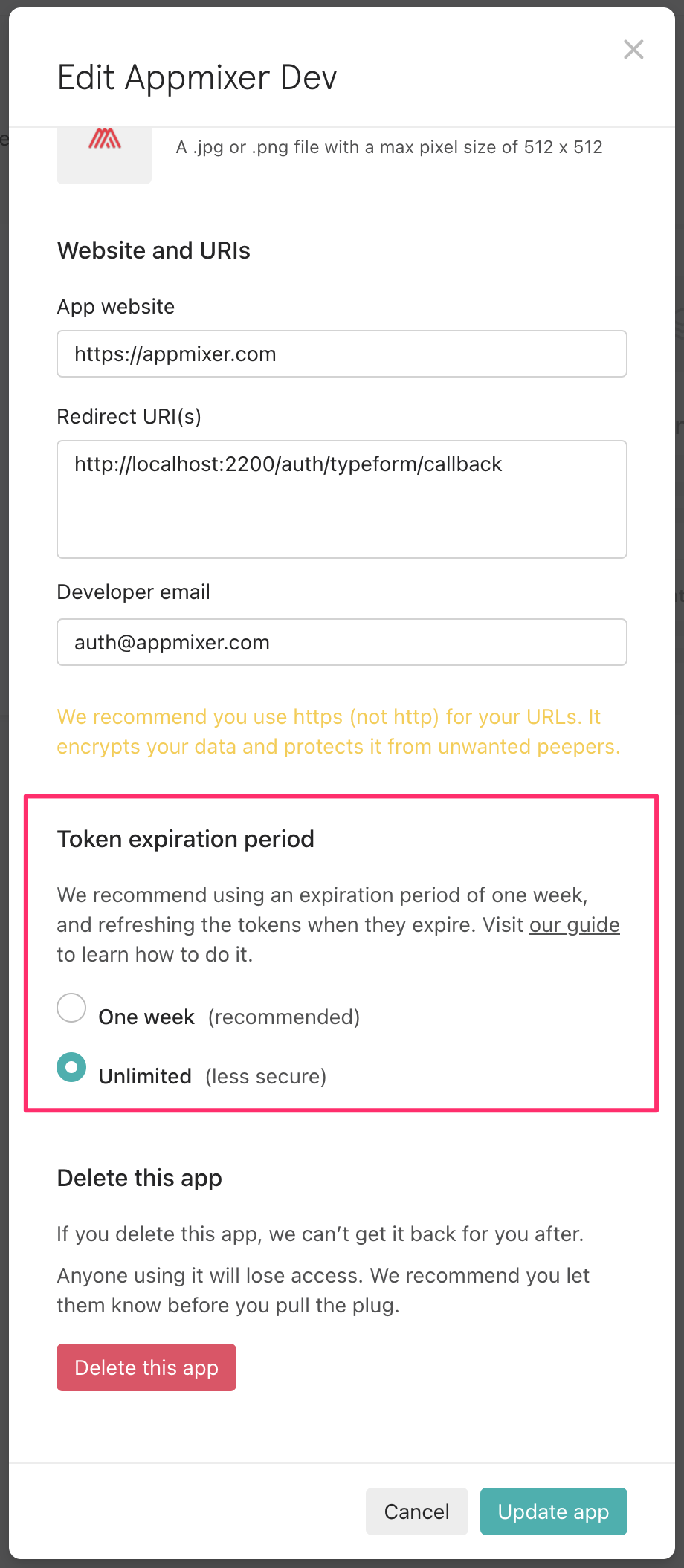 If you're registering the Oauth application for version 4.2 or newer, you can decide if you want to use tokens that do expire or not. If you decide to go with Unlimited then you don't have to set anything in the Backoffice, it is the default behavior. On the other hand, if you want to use tokens that expire, you have to go to the Backoffice and set the useRefreshToken to true for the appmixer:typeform service.