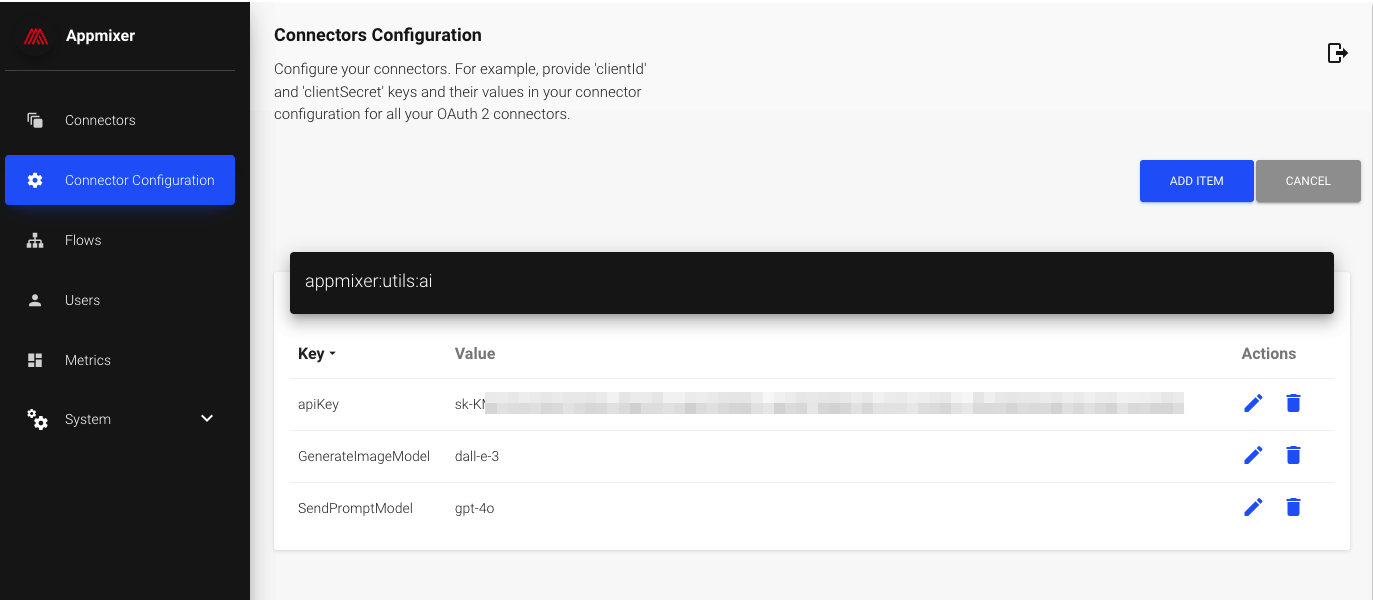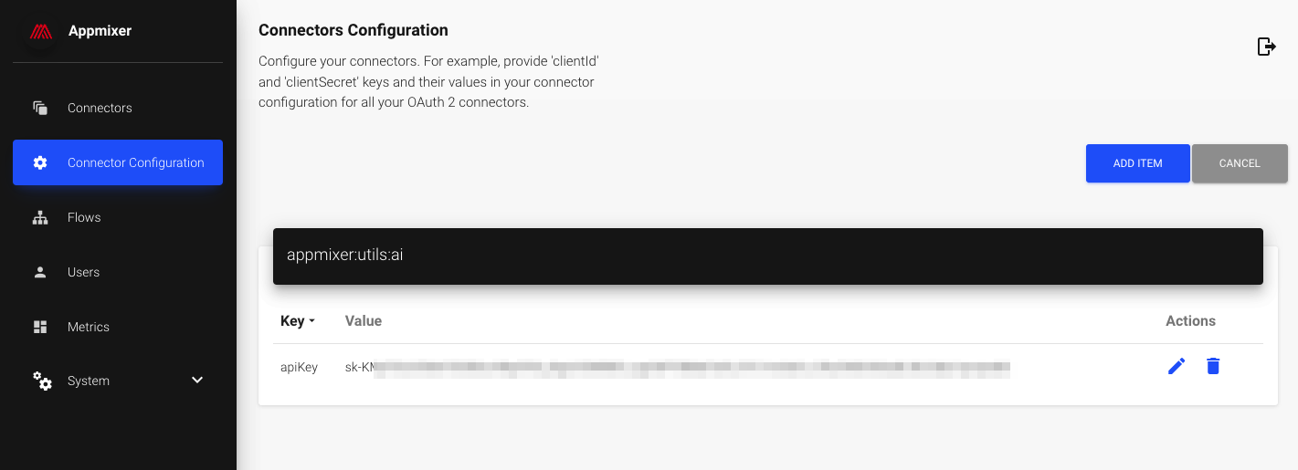 <figure><img src="https://content.gitbook.com/content/cfhstxIZQWZNvWjV2O6F/blobs/6fS9XH29VAvMoafxAp8O/image.png" alt=""><figcaption><p>appmixer:utils:ai connector configuration</p></figcaption></figure>