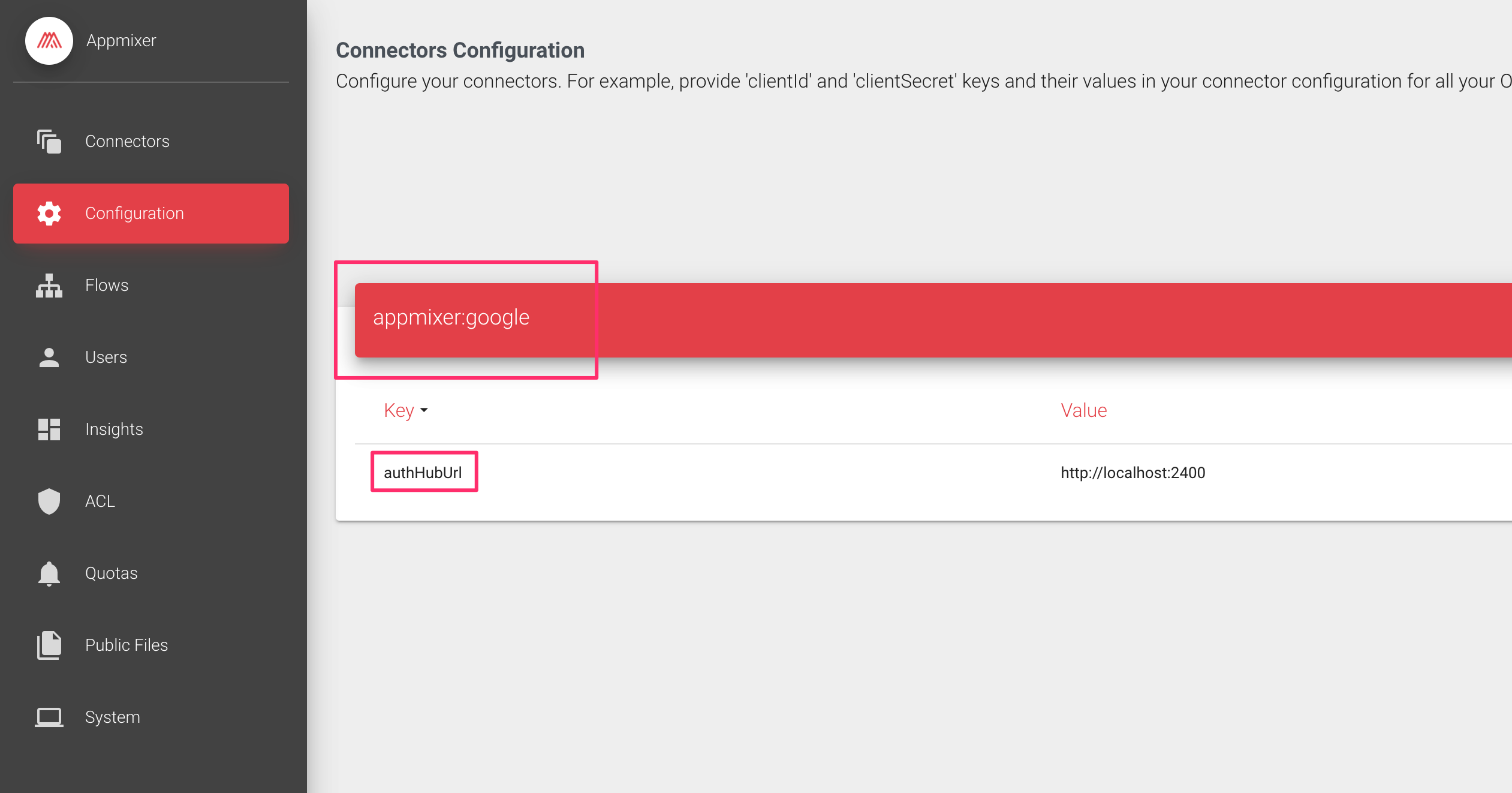 If the `AUTH_HUB_AUTOMATIC` is set to `false`, Appmixer checks the connector configuration. If the connector has clientId/clientSecret (OAuth 2), or consumerKey/consumerSecret (OAuth 1) configured through the Backoffice (Connector Configuration), Appmixer will not use the Authentication Hub (all OAuth requests will go directly from your Appmixer tenant to the relevant OAuth 3rd party). If you add `authHubUrl` to the connector configuration, all the authentication requests will be redirected to the Authentication Hub URL provided: