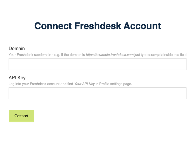 This is the definition for the Web Form that will be displayed to the user to collect information required by the third-party application. Freshdesk requires the domain name and the API key in order to authenticate the user. So we define two fields representing these two items and we define the label and tooltip that will appear in the form for each field. In this case, the auth definition will make Appmixer render a form like this: