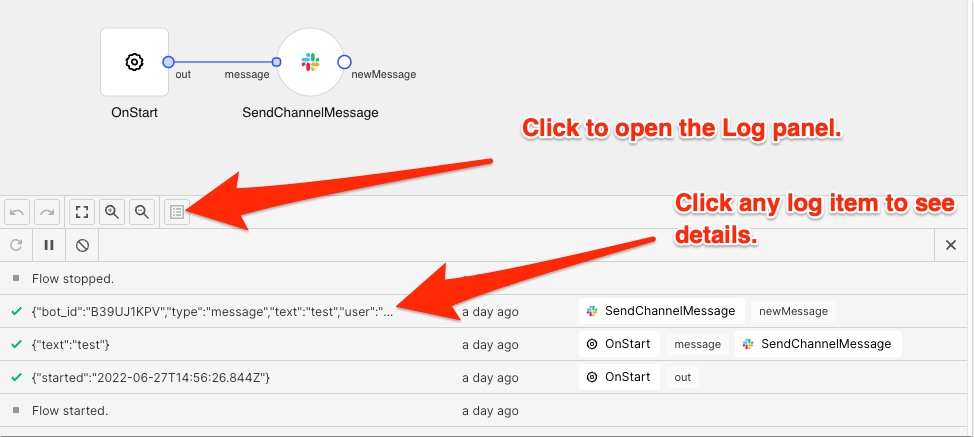 TIP: during debugging of your component, you'll be often re-packing/re-publishing the component and running a sample flow to see if it behaves correctly. Use the Log panel of the Designer UI to see the activity in your flow:
