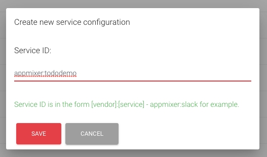 allow us to use service configuration values defined in the Backoffice admin panel. This is very handy if you don't want to hardcode certain values in your service/module/component definition and instead, make those values configurable via Backoffice. To do that, visit your Appmixer tenant Backoffice interface, go to "Services", click "Add" to add a new service configuration, provide the correct service ID in the form [vendor]:[service]