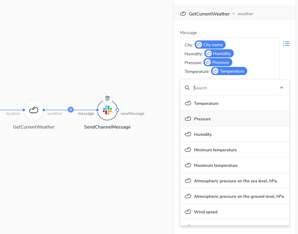Components can have zero or more output ports. Each output port has a name and optionally an array options that defines the structure of the message that this output port emits. Without the options object, the user won't be able to see the possible variables they can use in the other connected components. For example, a component connected to the weather output port of our GetCurrentWeather component can see the following variables in the variables picker: