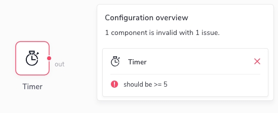 The JSON Schema gives you enough flexibility to describe your property types and the required format, possibly using regular expressions or other mechanisms. When the user fills in the forms in the Designer UI inspector to configure their components, the Designer automatically validates all inputs using the schema. If any of the properties are invalid, the Designer UI gives an immediate feedback to the user that they should correct their configuration: