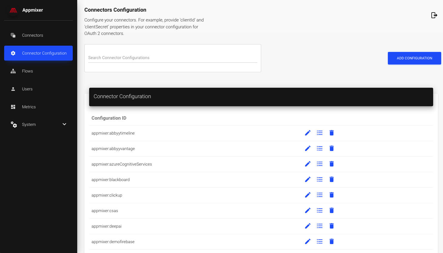 The Connector Configuration is available via the Appmixer Backoffice interface: