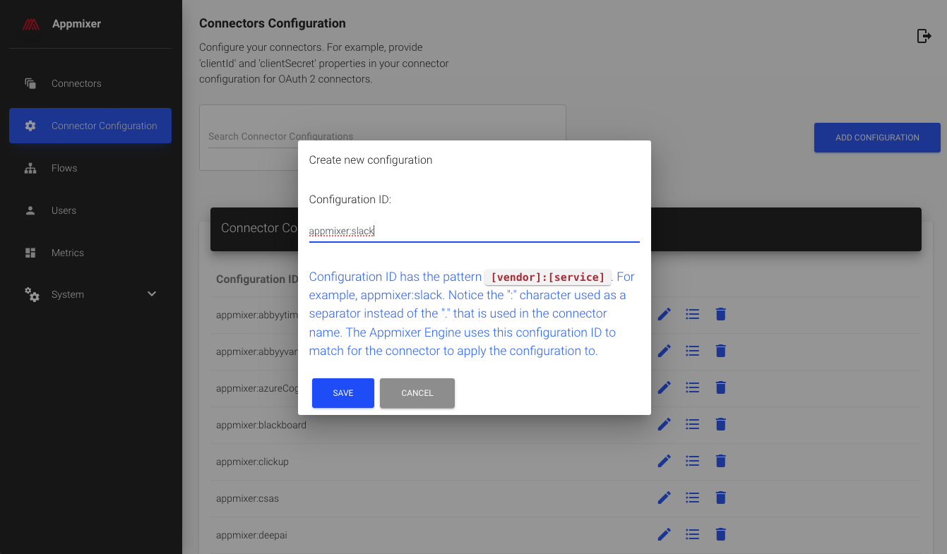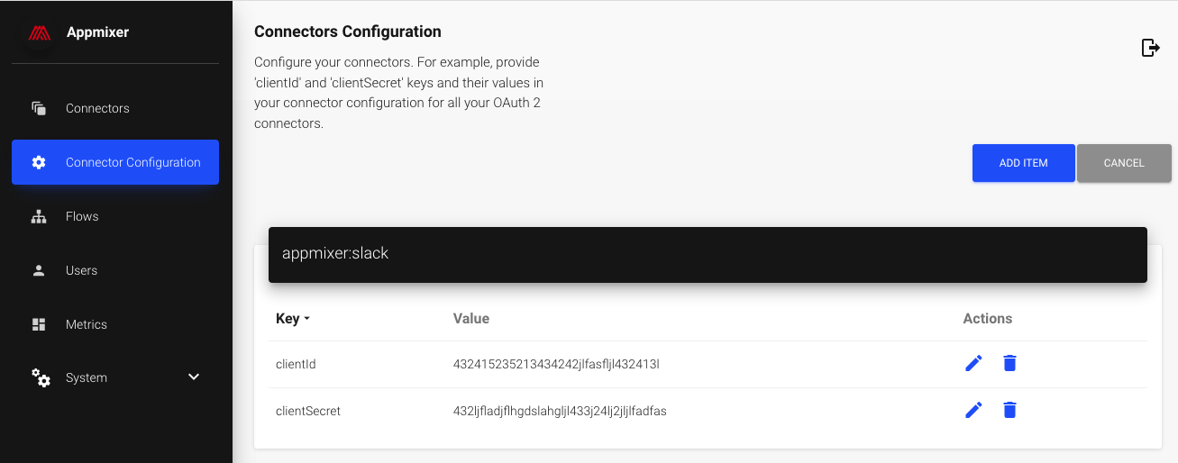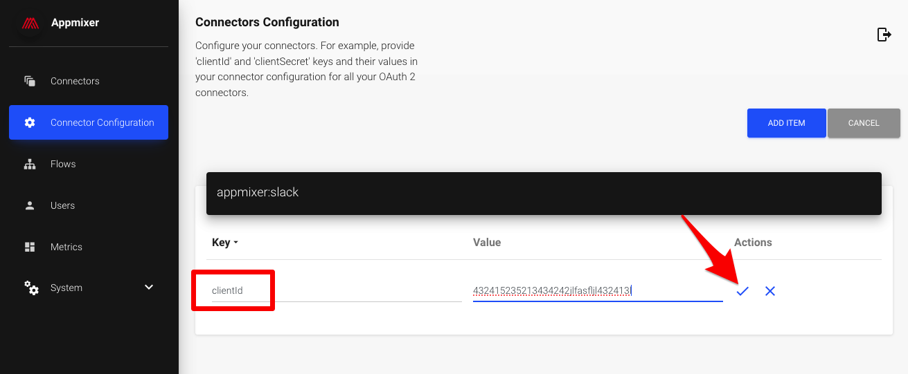 For the Configuration ID, use appmixer:slack. You are now ready to add the Slack OAuth app clientId and clientSecret.
