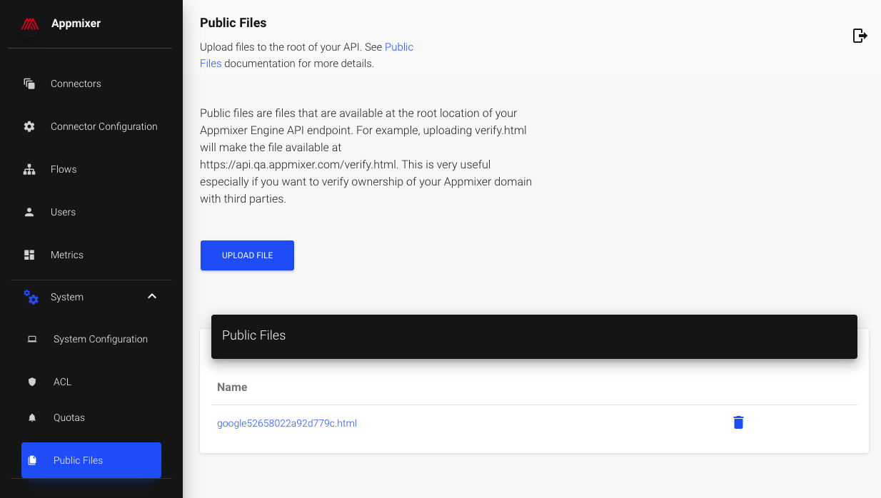 Once you've uploaded your files through the Appmixer Backoffice, they will be accessible via your Appmixer Tenant API URL. For instance, if you upload a file named google52658022a92d779c.html, it can be accessed at https://api.YOUR_TENANT.appmixer.cloud/google52658022a92d779c.html as well as at the well-known directory URL https://api.YOUR_TENANT.appmixer.cloud/.well-known/google52658022a92d779c.html. This accessibility ensures that third-party services can easily verify domain ownership by locating the specified file at your domain's root or the well-known directory.