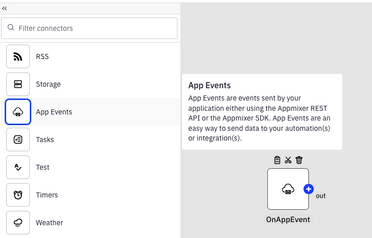 App Events provide the simplest method for sending data to Appmixer. To utilize App Events, select the OnAppEvent trigger from the Utilities category of connectors: