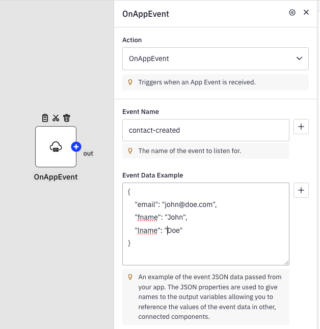Providing an Event Data Example populates all detected JSON fields as variables in subsequent connected components. This allows you to easily use and reference these data placeholders throughout your integration, ensuring that the necessary information is accessible and can be dynamically incorporated into various parts of your workflow. This practice enhances the configurability and functionality of your automations by clearly mapping out how data flows between components.<br>