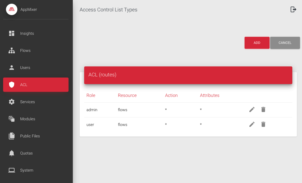 Or programatically via the Appmixer REST API. A common practice is to first get the existing set of ACL rules for the routes category and if the newly created scope is not in the list, just add it (note again that you need admin user token to manipulate ACL rules):