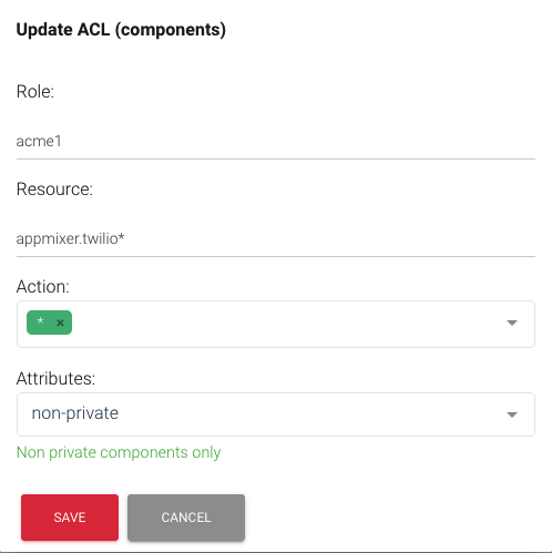 Note the wildcard (* ) character after the module namespace. If we didn't do that, although the user will have access to the module itself, they won't be able to see any components within that module (e.g. appmixer.twilio.sms.SendSMS). The wildcard character makes sure all the components within the appmixer.twilio namespace are matched. If you don't use the wildcard, you can give users access to only a particular set of components within modules instead of the entire module.