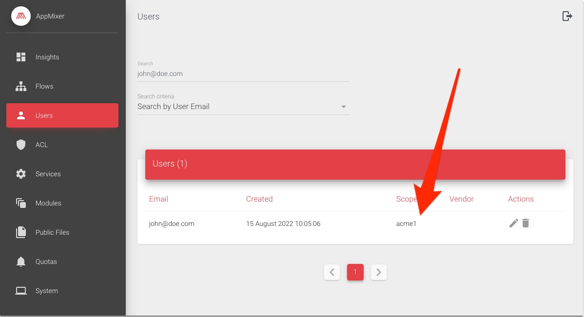 curl -XGET "https://api.YOURTENANT.appmixer.cloud/users?filter=scope:acme1&sort=created:-1&limit=30&offset=0" -H 'Authorization: Bearer ADMIN_USER_TOKEN'Configure ACL rules for a scope