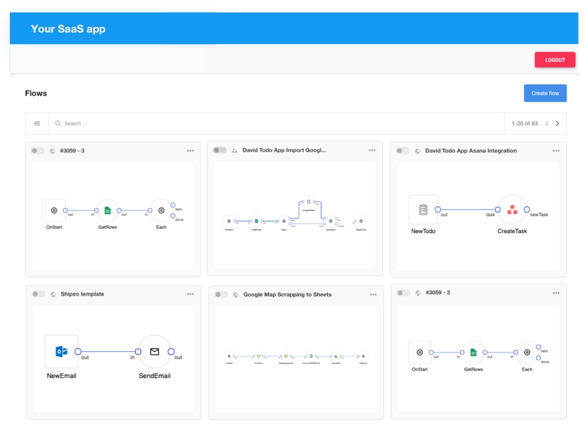 The easiest way to create virtual user accounts is via the client-side Appmixer JavaScript SDK. The SDK provides methods to authenticate virtual users and to create new virtual users. You can find a full example in the SDK Getting Started guide. Let's say you have a page in your web application where you want to display the Appmixer FlowManager UI widget so that your end-users can see the flows they created and create new ones: