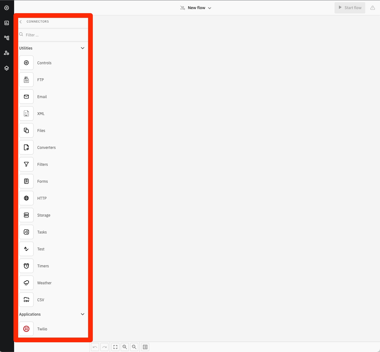 Once you save those two rules and create a flow on behalf of the user in the Appmixer studio, you should see the utility and twilio modules displayed: