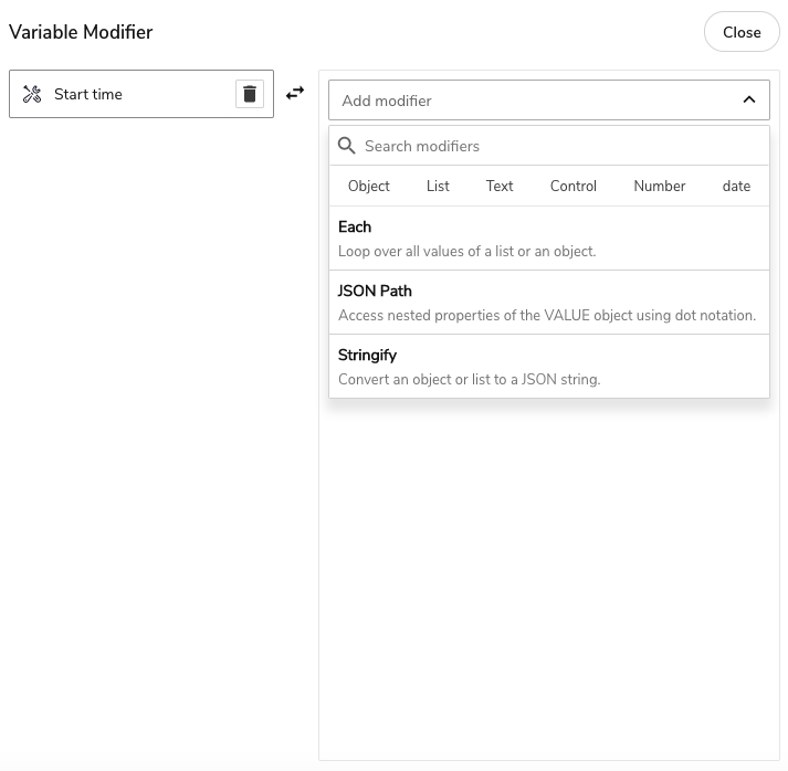 Appmixer is shipped with predefined set of modifiers which allows you to transform the variables in your flow in many different ways. The modifiers are organised in categories. Every modifier belongs to one or more categories.