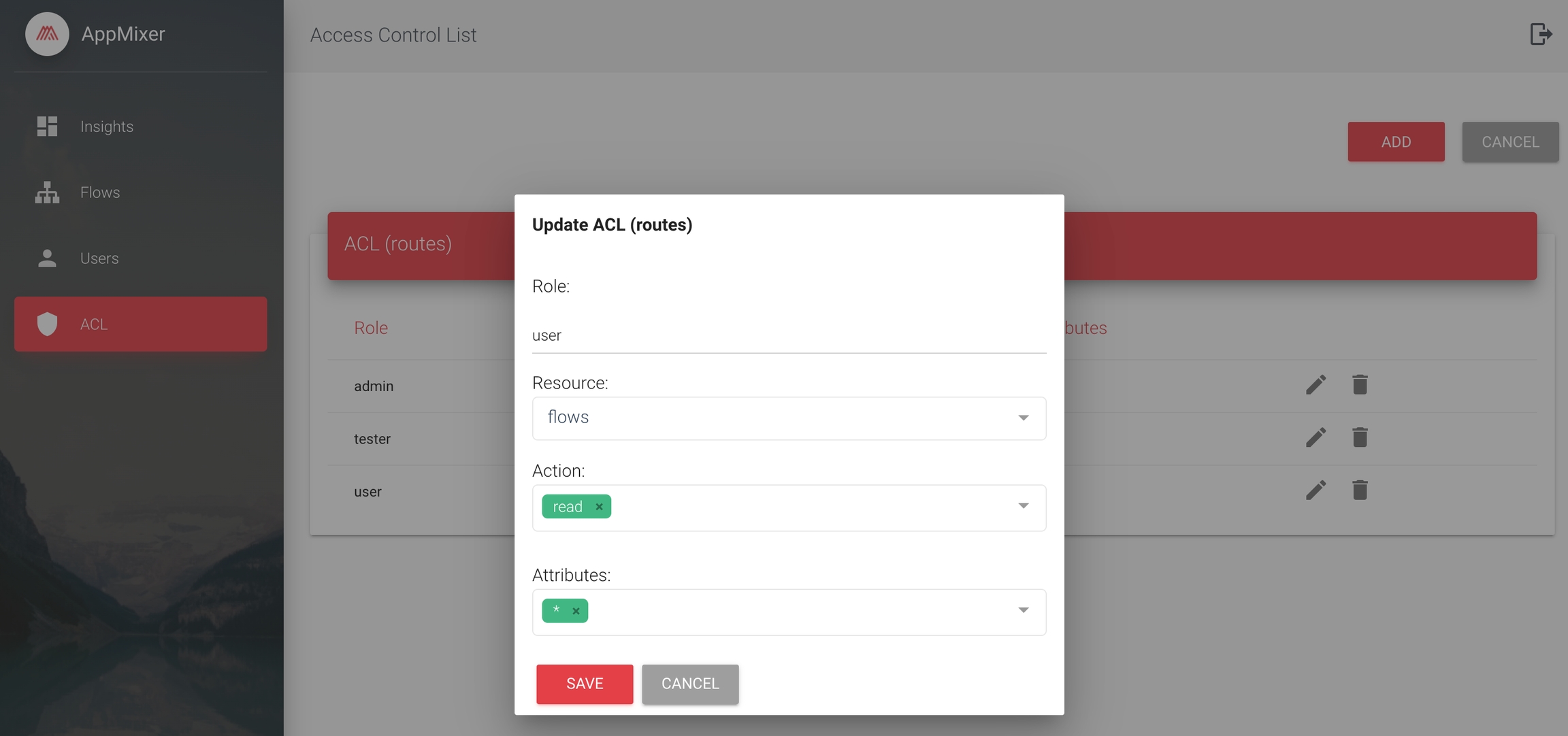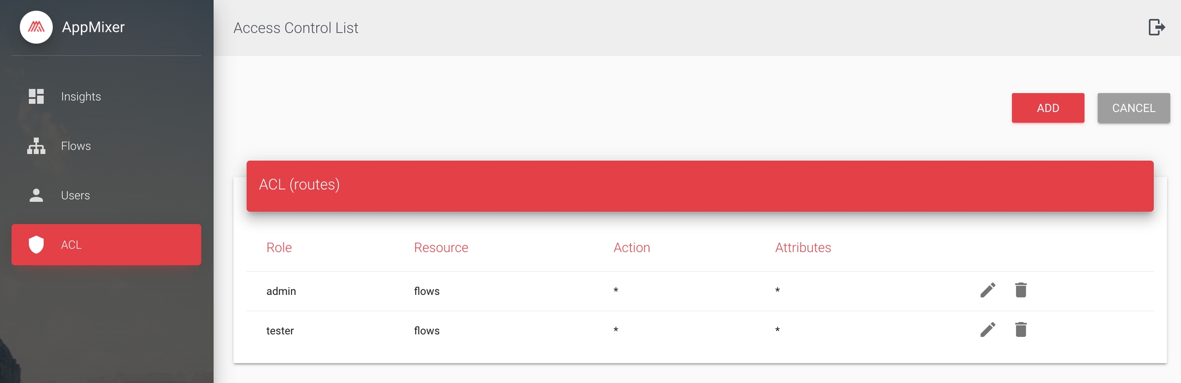 You can define ACLs to restrict access to Flows API. The default setting is similar to the one for Components. All roles can access all actions on flows resource.