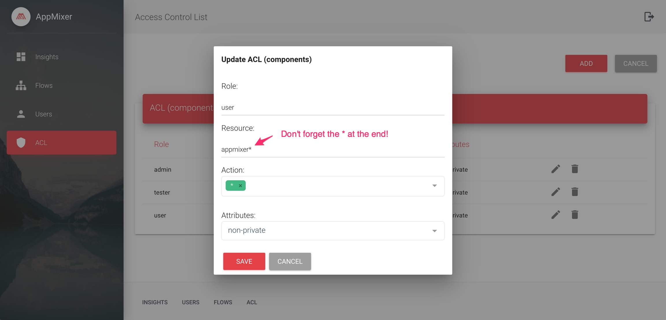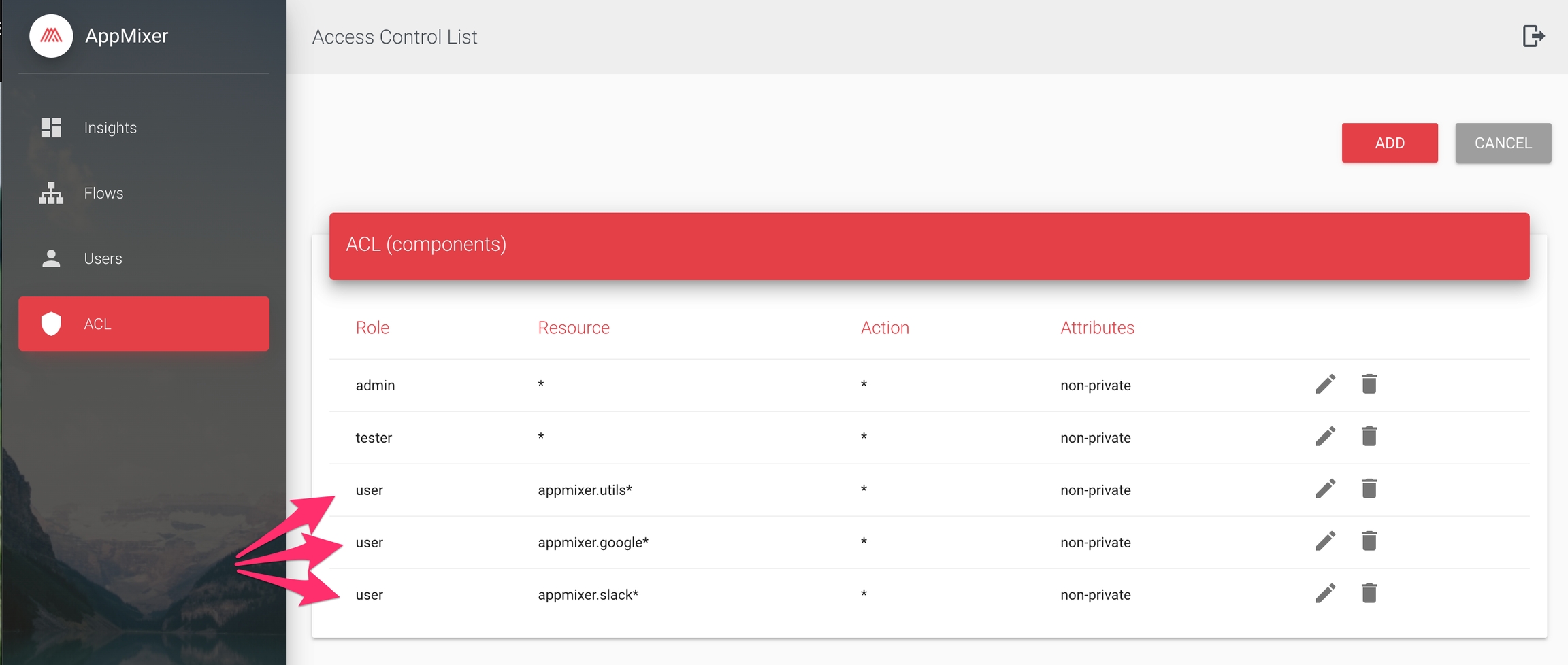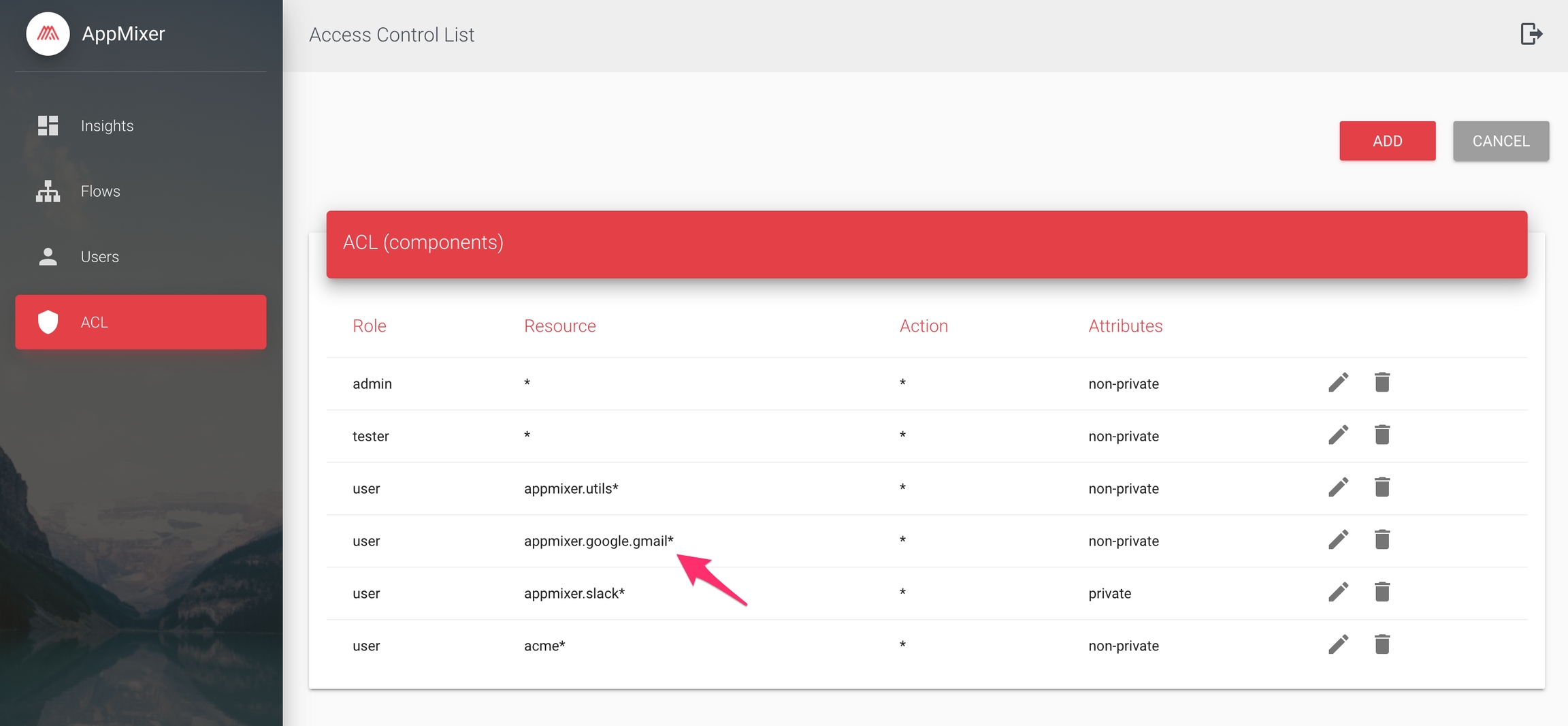 resource: component type prefix (appmixer.google.gmail* for example). This allows to create rules for components belonging to certain vendor, service or module. In the example above we created a rule for all appmixer components. The resource string was appmixer* which will cover all appmixer components.
