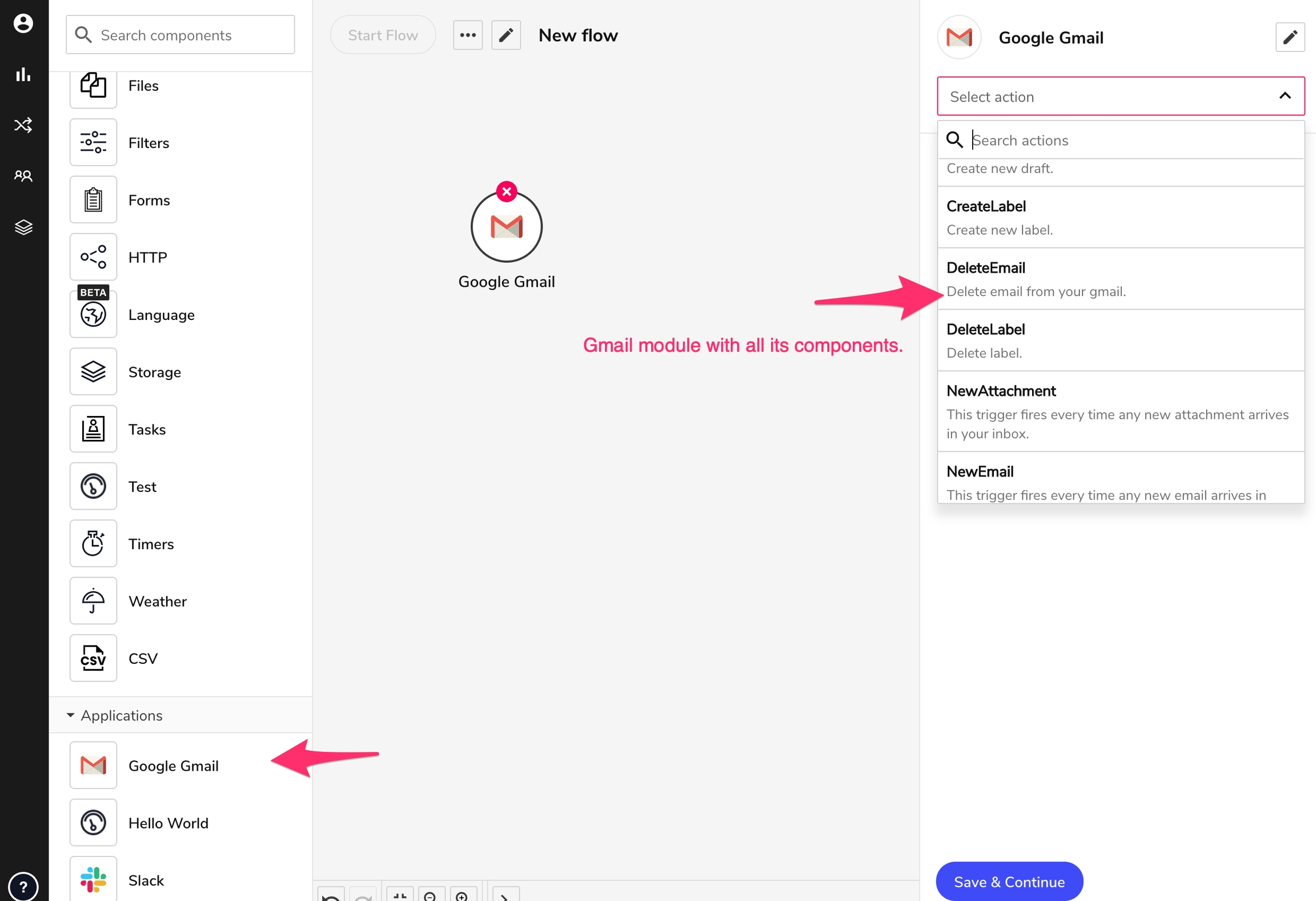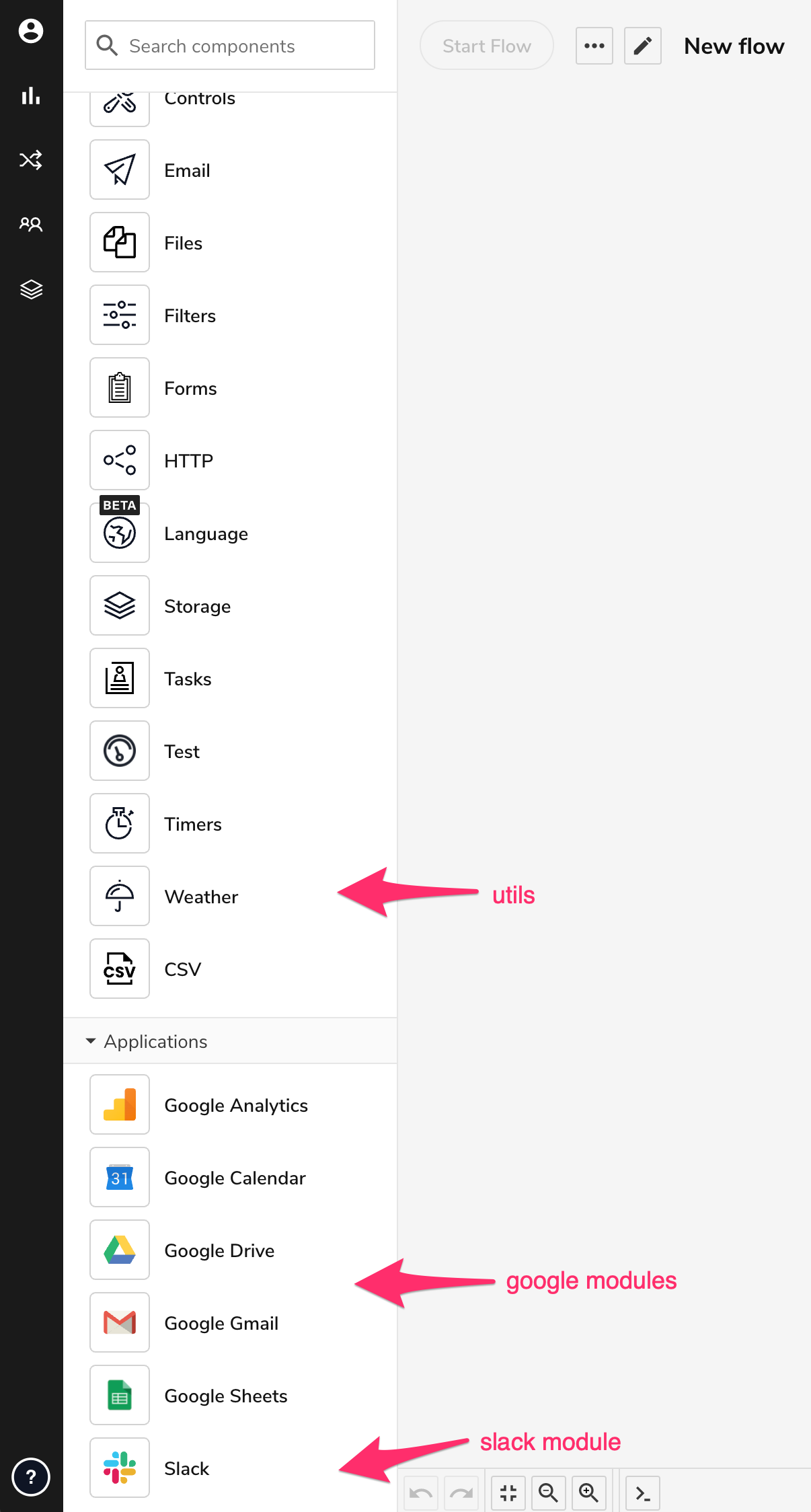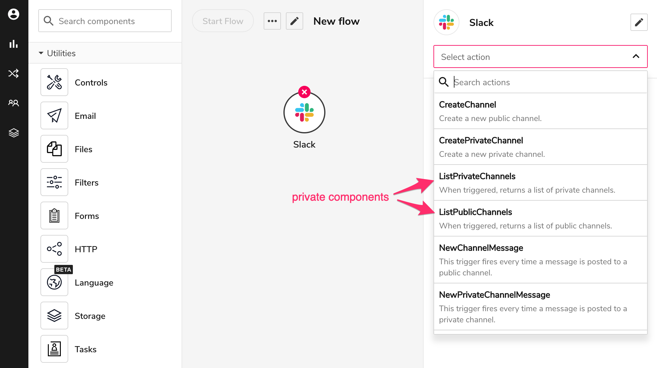 Because we used attribute non-private for all our rules we can see only components where private: true is not set in their manifest. Most appmixer component modules user private auxiliary components for listing items into menus (slack channels for example). Therefore we don't see those private components in this menu: