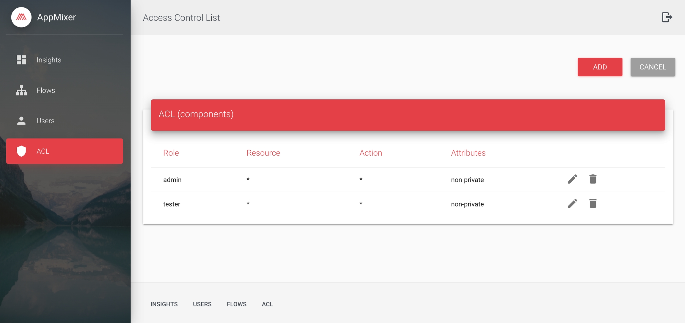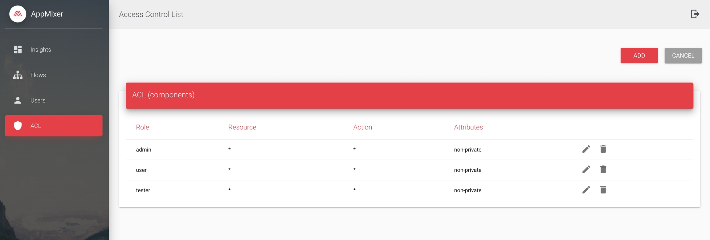 When you open the components section, you can see the default ACL rules. Users with the scope admin, user and tester can use all non-private components. Components can be hidden using the private property defined in the component manifest file. You can decide to make these private components visible to certain user groups using ACL.