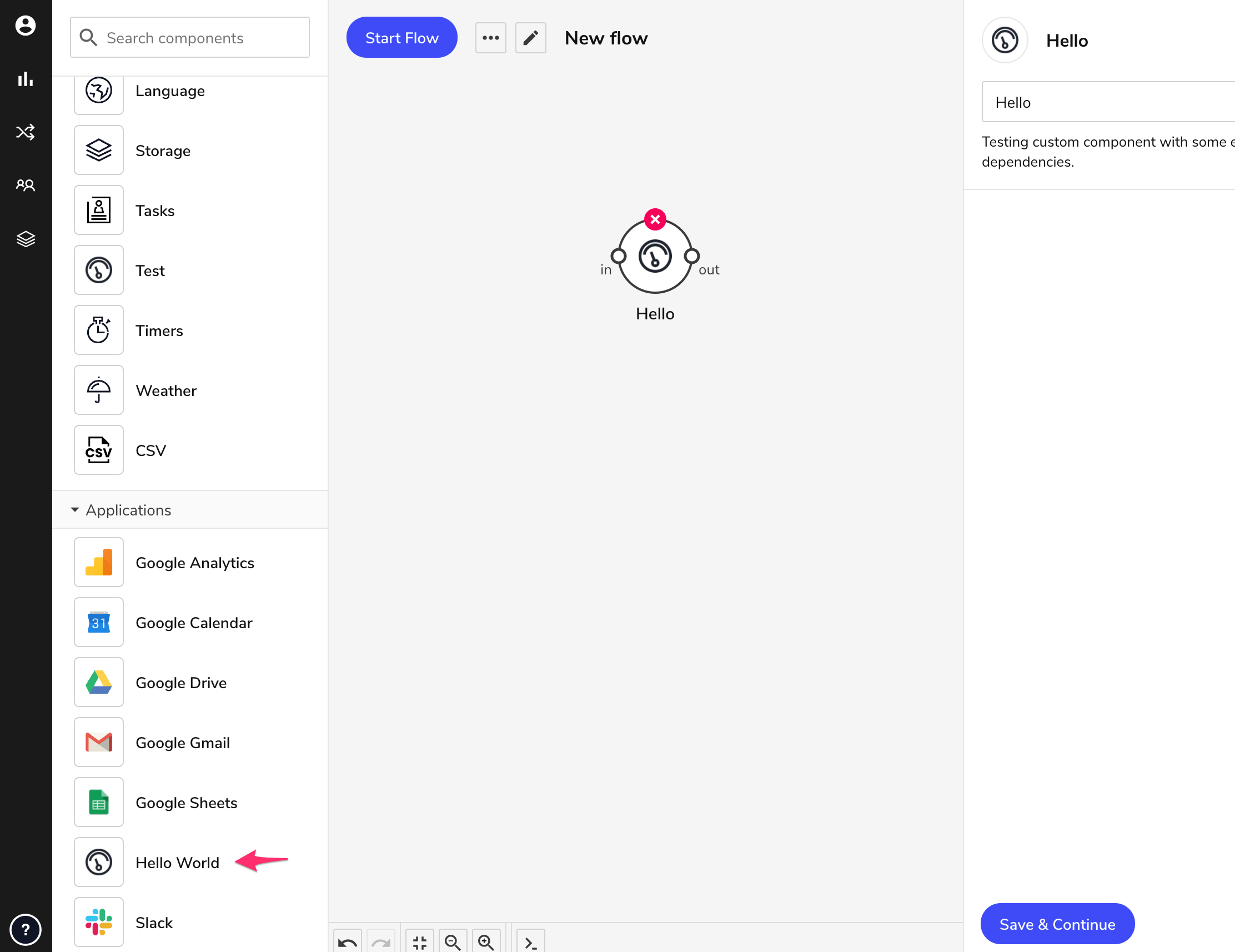 When you start writing your own components you should use your own vendor (not appmixer). We are adding Hello World component for example under vendor acme. Its component type is acme.custom.component.HelloWorld. Then we have to publish the component into Appmixer and create new ACL rule that will make it accessible to users.
