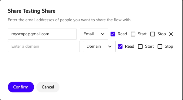 The Appmixer SDK allows you to configure the sharing options available to the user. For example, you can define that the share dialog will give the user permission to share their flow only for read (and not stop/start) with: