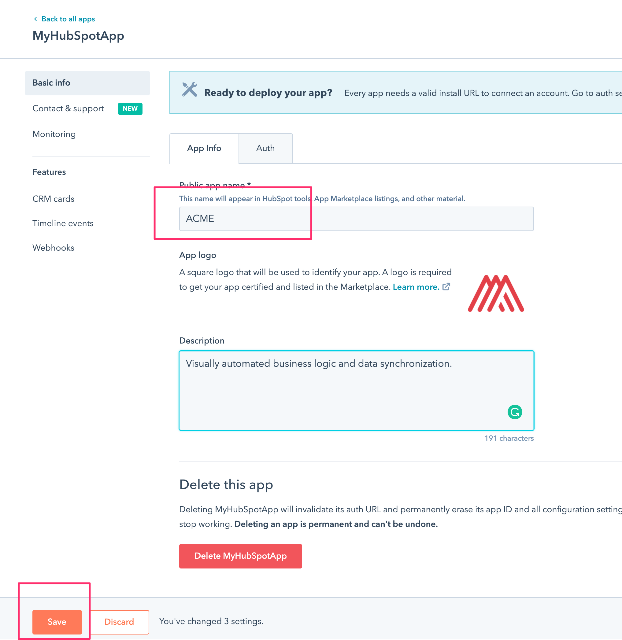 Go back to Hubspot and set the redirect URL, replace acme.com with your domain and keep the suffix /auth/hubspot/callback