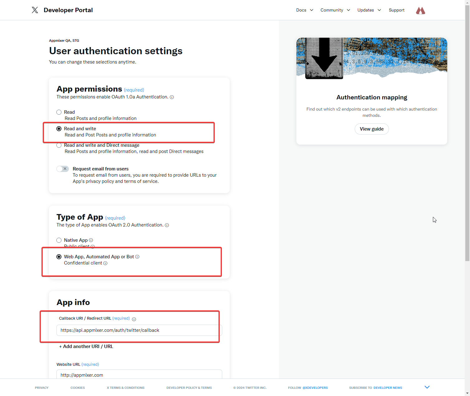 https://[YOUR_API_BASE]/auth/twitter/callback, for examplehttps://api.appmixer.com/auth/titter/callback