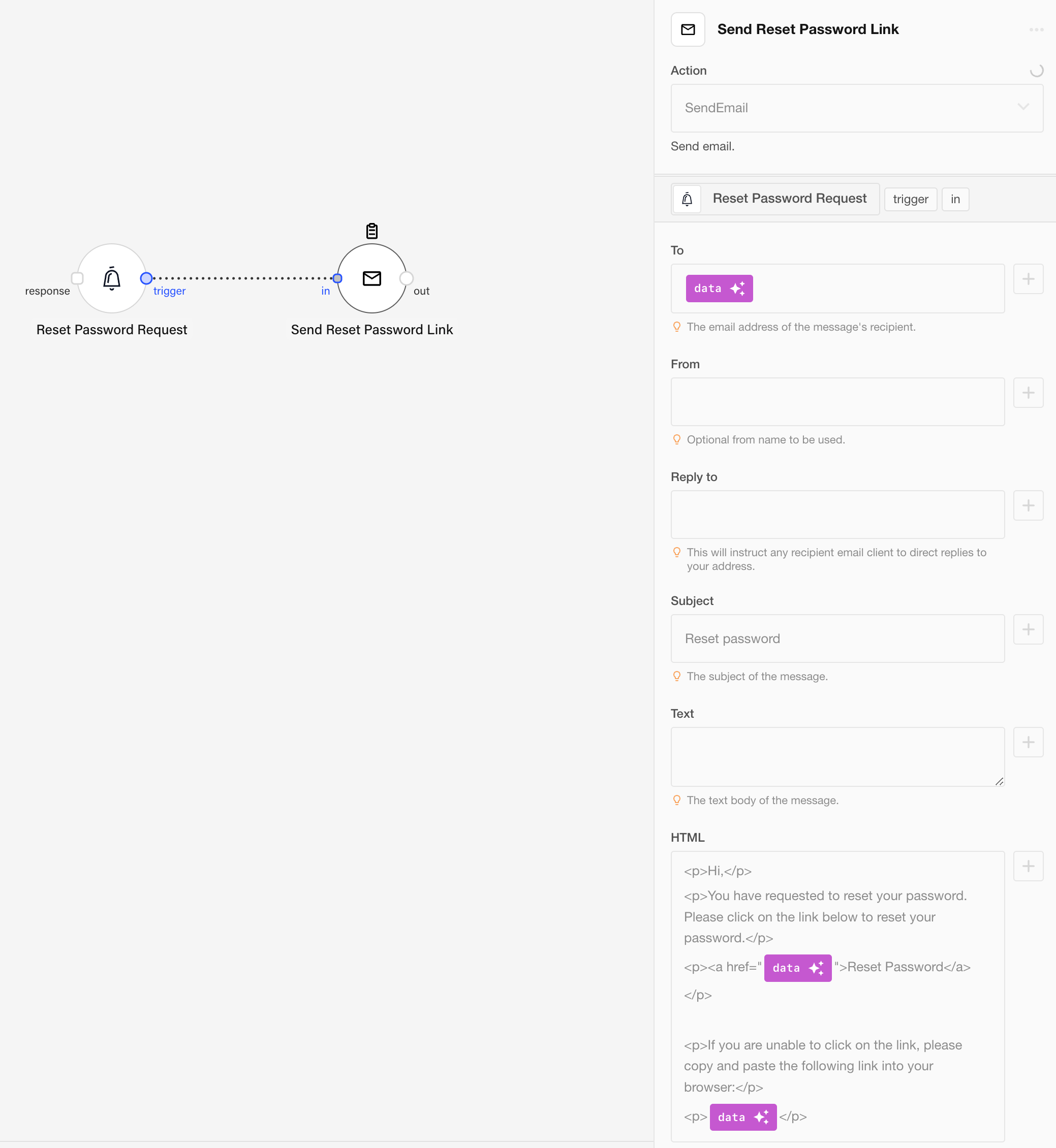 If the forgot password webhook is configured as explained above, the Appmixer engine will not send the email to the user and it will trigger the webhook instead.