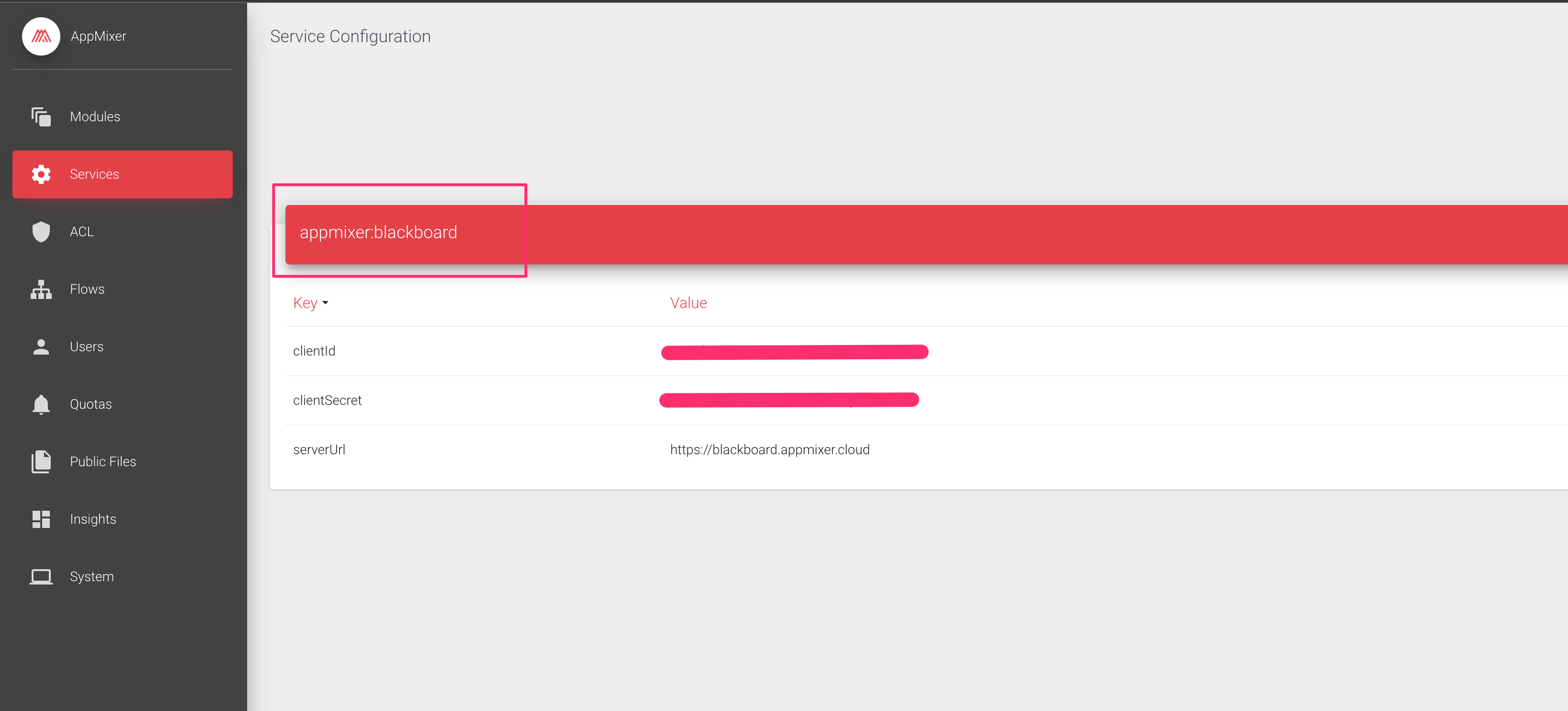 Next, log into the Backoffice and go to Services. Next create a configuration for *appmixer:blackboard*. Finally, add your Application ID as *clientId* and Secret as *clientSecret.* Also set *serverUrl* to your instance URL: