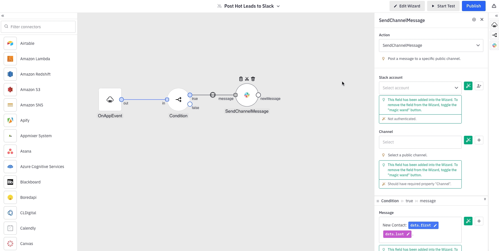 Configure the Condition component to check whether the hotLead property from the OnAppEvent trigger is set to true. Use the "+" button next to any configuration field. This feature allows you to reference data from any component earlier in the integration flow (data variables), regardless of its depth in the workflow.